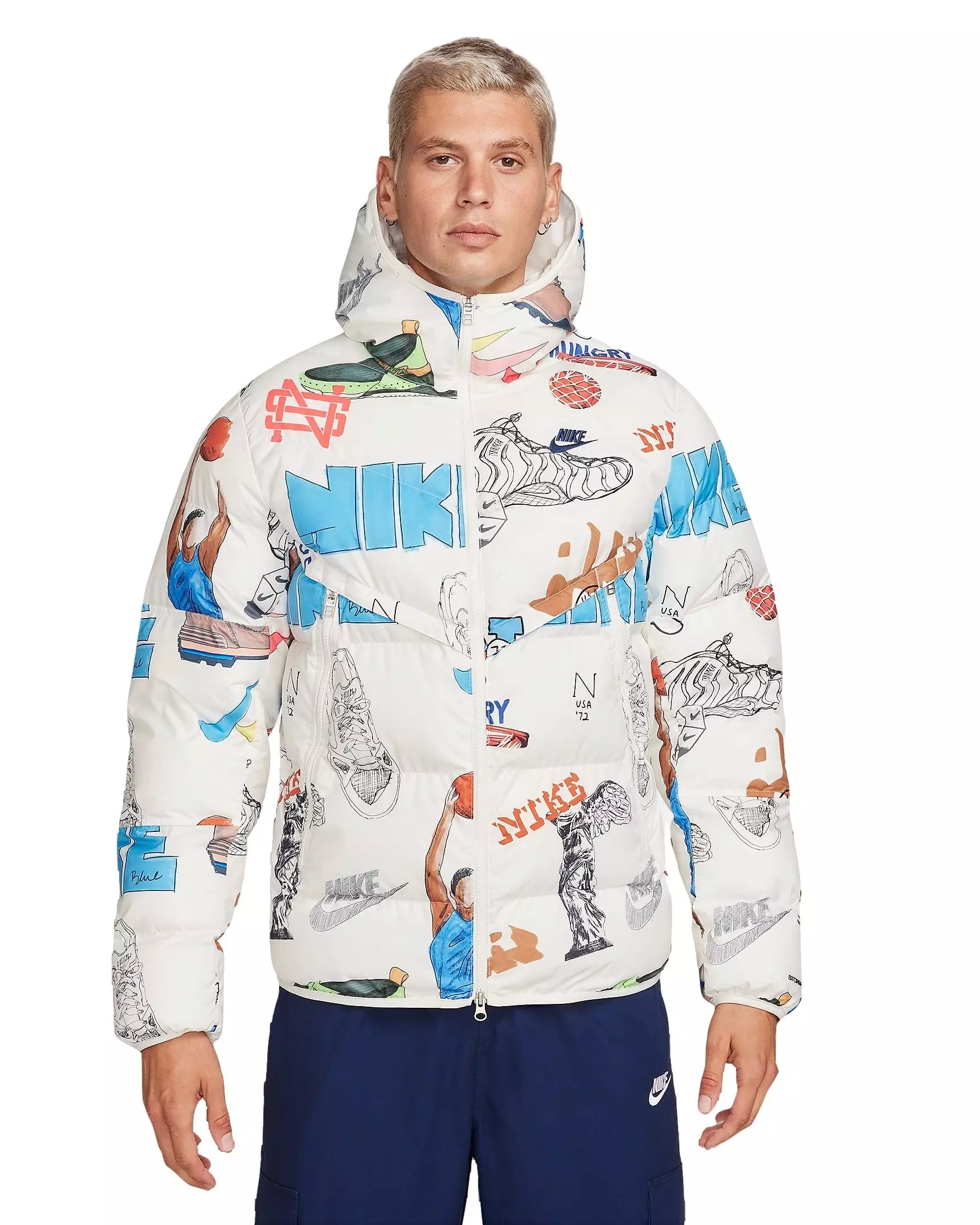 Don’t let cold and windy weather dampen your style in this hooded Nike Men's Storm-FIT Windrunner Hooded Jacket featuring vintage Nike sketches. With Storm-FIT technology and PrimaLoft® insulation, it offers elevated warmth, protection and cold-weather comfort. The shell fabric works to shed rain, while the insulation helps to lock in your natural warmth. Stay warm, stay dry and look your best in the elements.Features