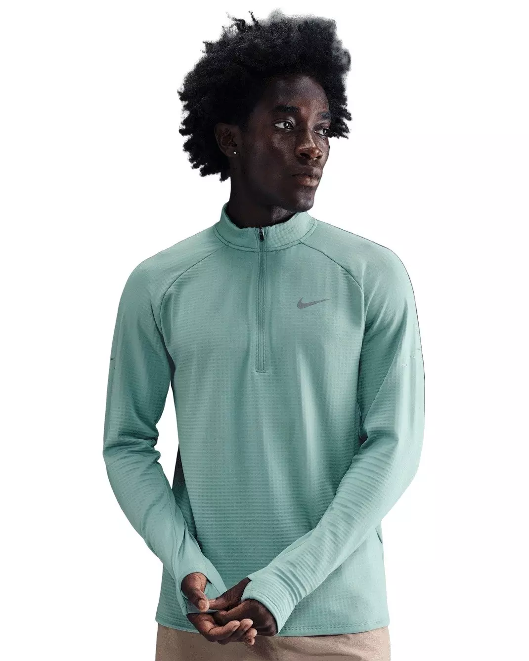 Don't let harsh weather stop your stride. This Nike Men's Stride Therma-FIT Repel Winterized 1/2-Zip Running Top is built with heat-regulating tech and a water-repellent finish to help you stay warm and comfortable mile after mile. Raglan sleeves help reduce underarm chafing and the waffle-like interior feels extra soft and lightweight.Features