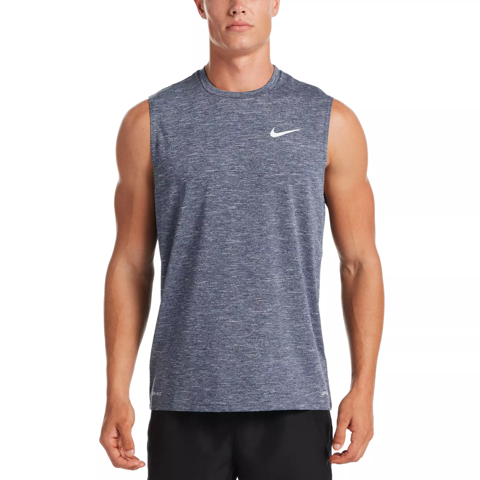 Nike Men's Swim Heather Sleeveless Hydroguard boasts Dri-FIT technology to help you stay comfortable both in the pool and the beach. The heathered fabric boasts plenty of stretch for a flexible fit and a wide range of motion. UPF 40+ protection helps to defend UV rays from penetrating through the swim shirt.Features