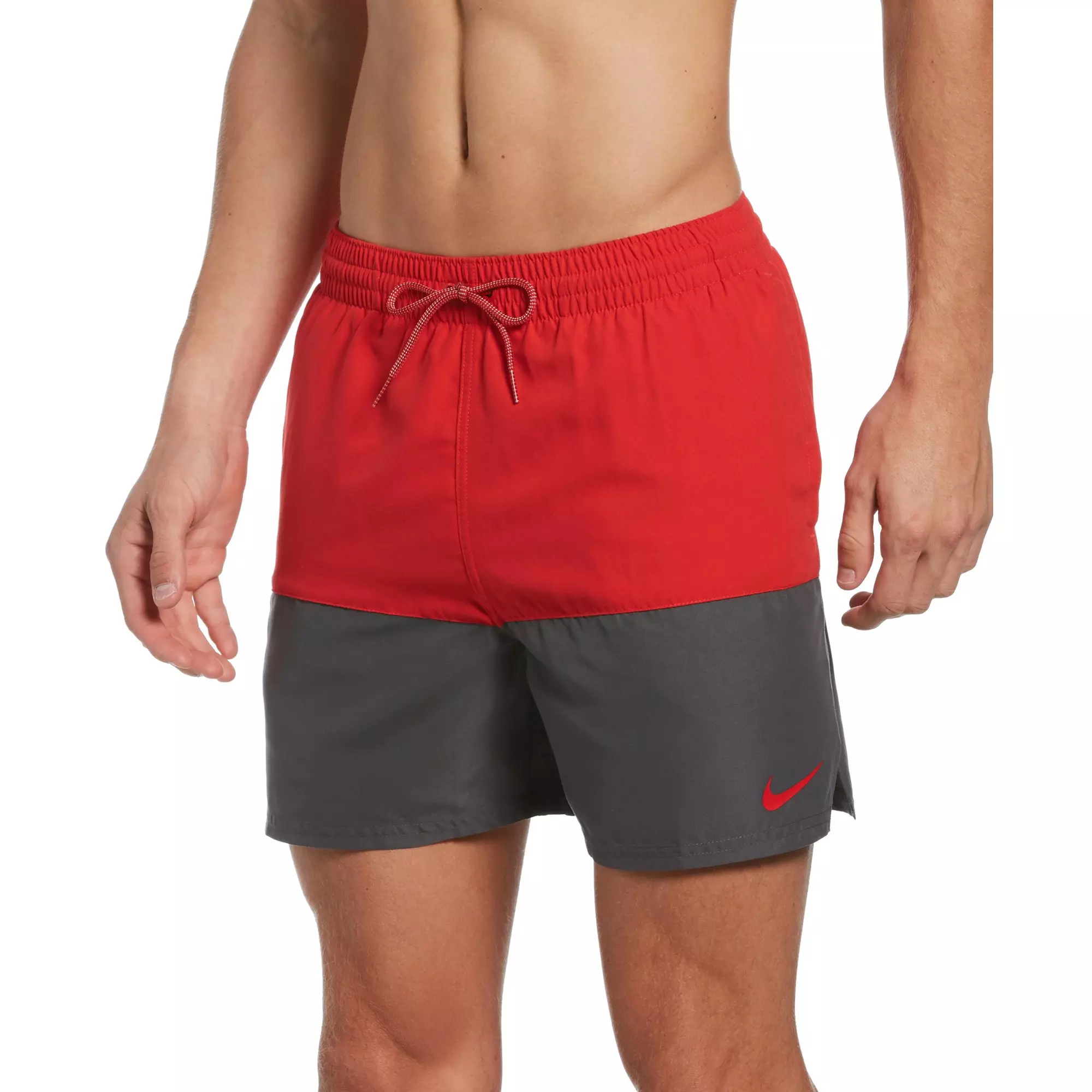 Nike Men's Swim Split 5" Volley Swim Trunks deliver a cool two-tone design in a comfortable fit. The sleek swimming trunks have a built-in mesh brief for a secure and supportive fit and a stretch waistband with exterior drawcord. On seam pockets with mesh pocket bags allow for efficient water drainage. For secure storage, an internal mesh pocket keeps small items close.Features