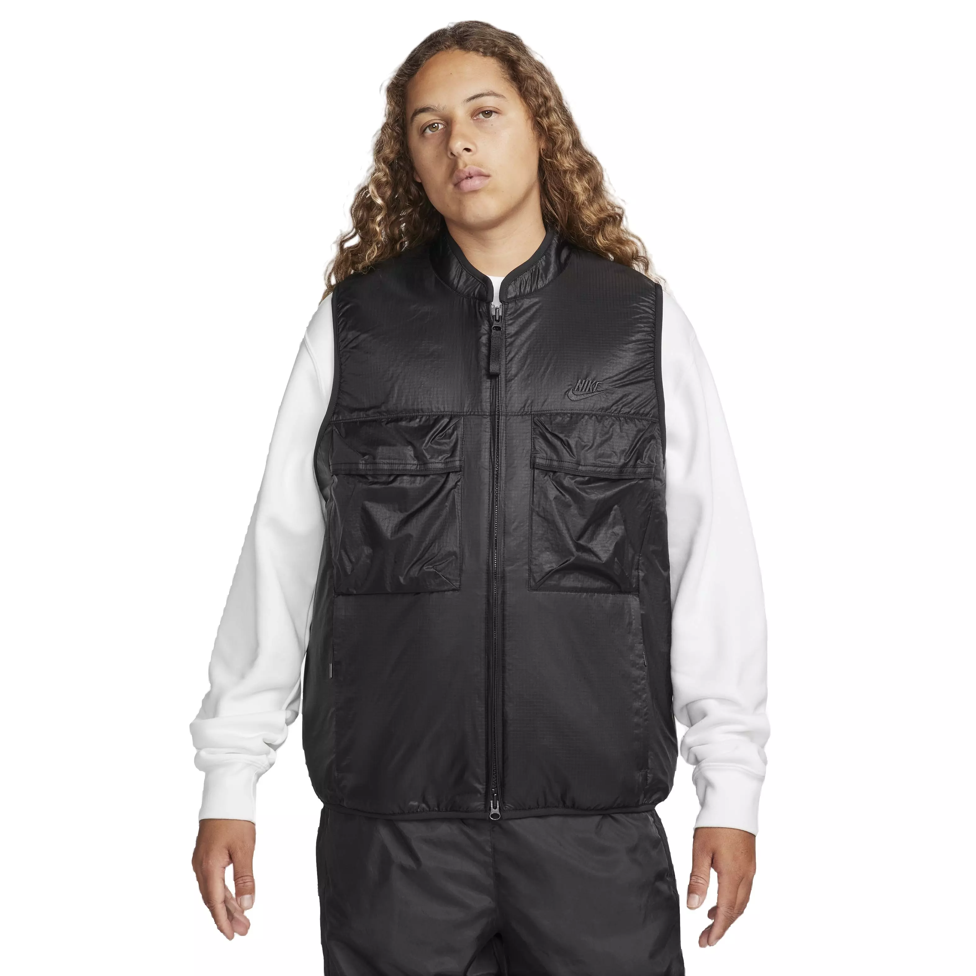 This Nike Men's Tech Fleece Utility Vest - Black blends water-repellent woven fabric with soft Tech Fleece. It features a full-zip front with patch chest pockets and zippered hand pockets that secure essentials on the move.