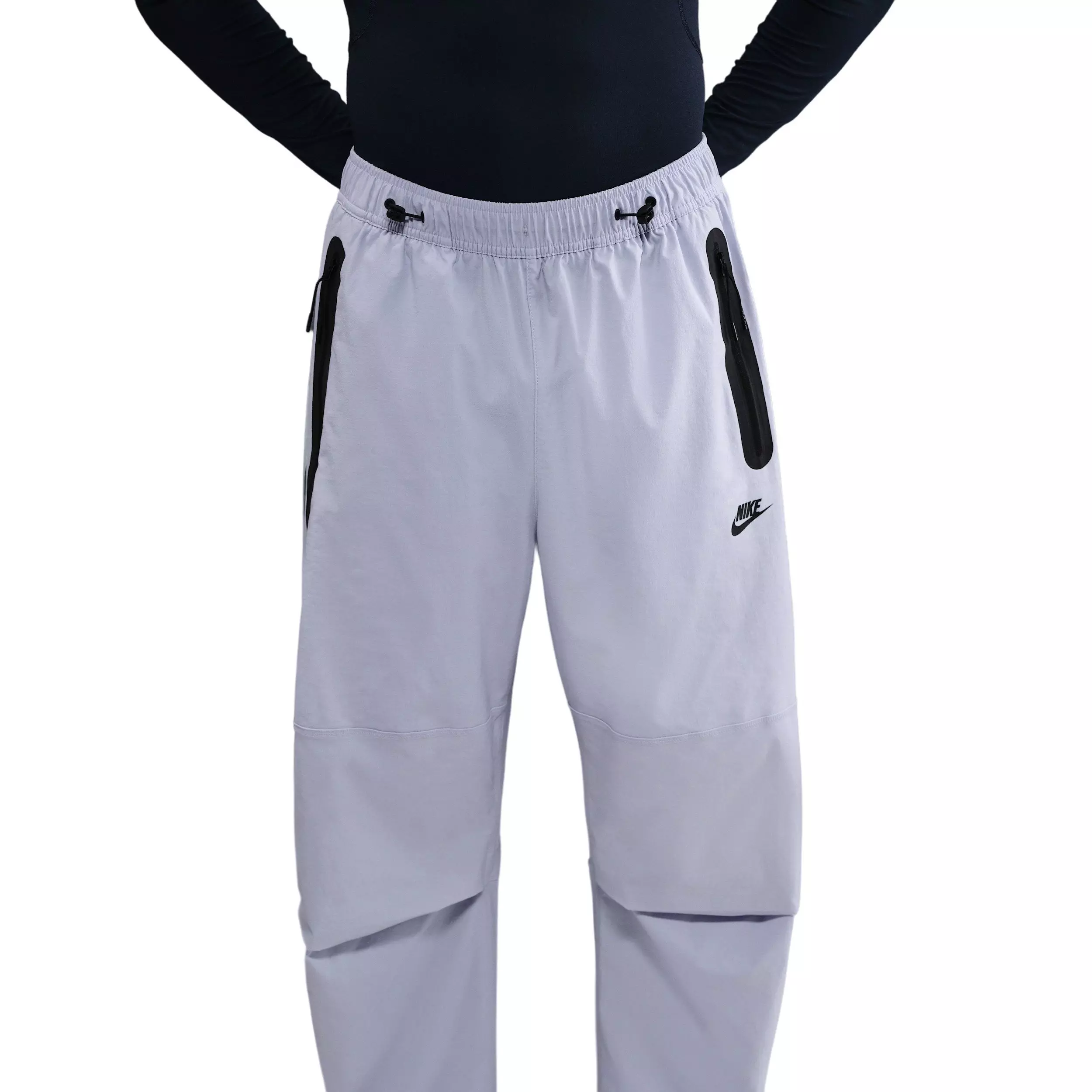 These Nike Men's Tech Woven Oversized Pants use stretchy woven material to boost mobility and adaptability. A wide-leg cut pairs with ankle bungee locks that let you switch up the fit and maintain a tailored shape.