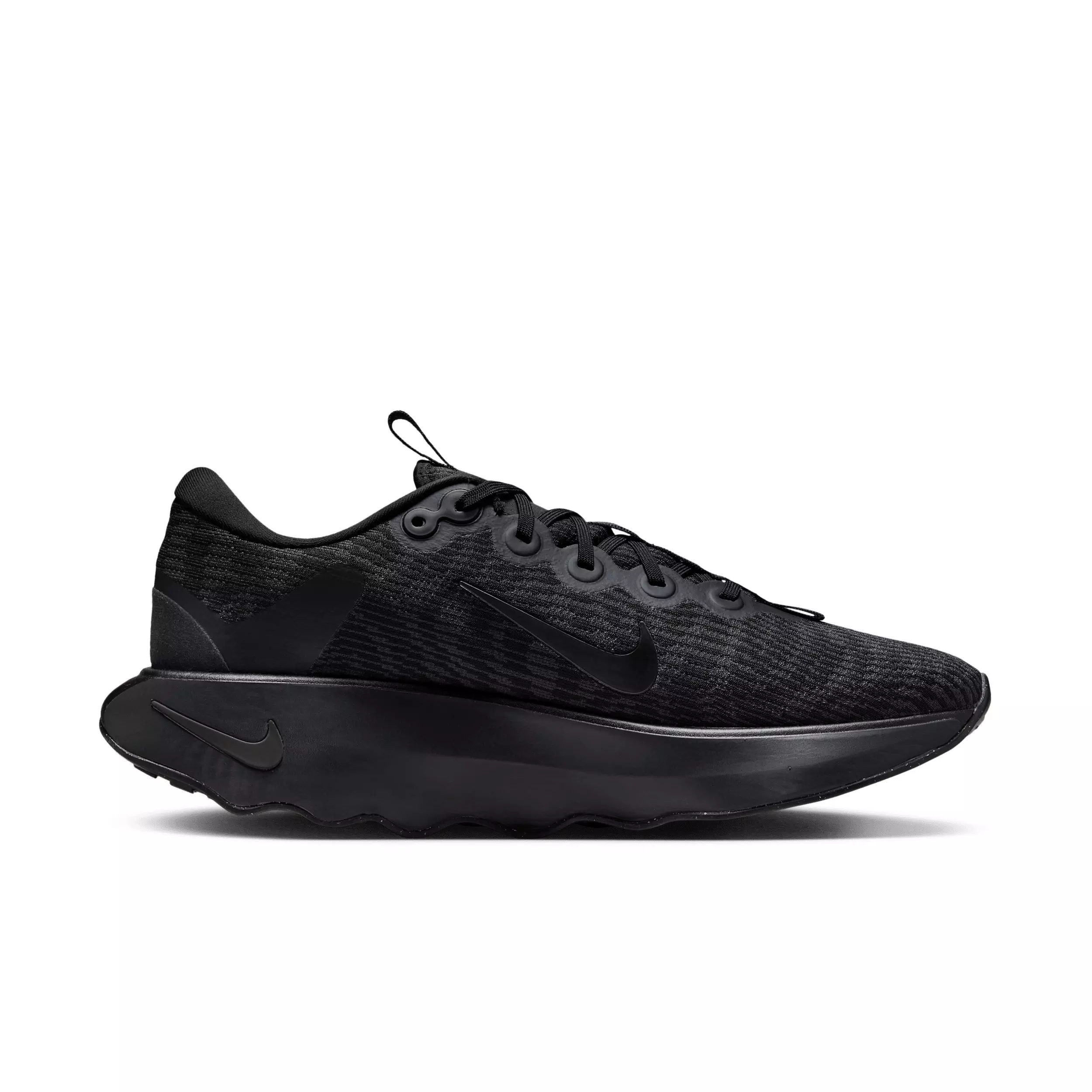 Designed for walking in ultimate comfort, the Nike Motiva "Black/Anthracite/Black" Men's Walking Shoe provides our highest level of cushioning. A tall foam stack combines with our Comfortgroove innovation on the outsole to absorb the bumps along the way. And its exaggerated rocker helps propel you forward.Features