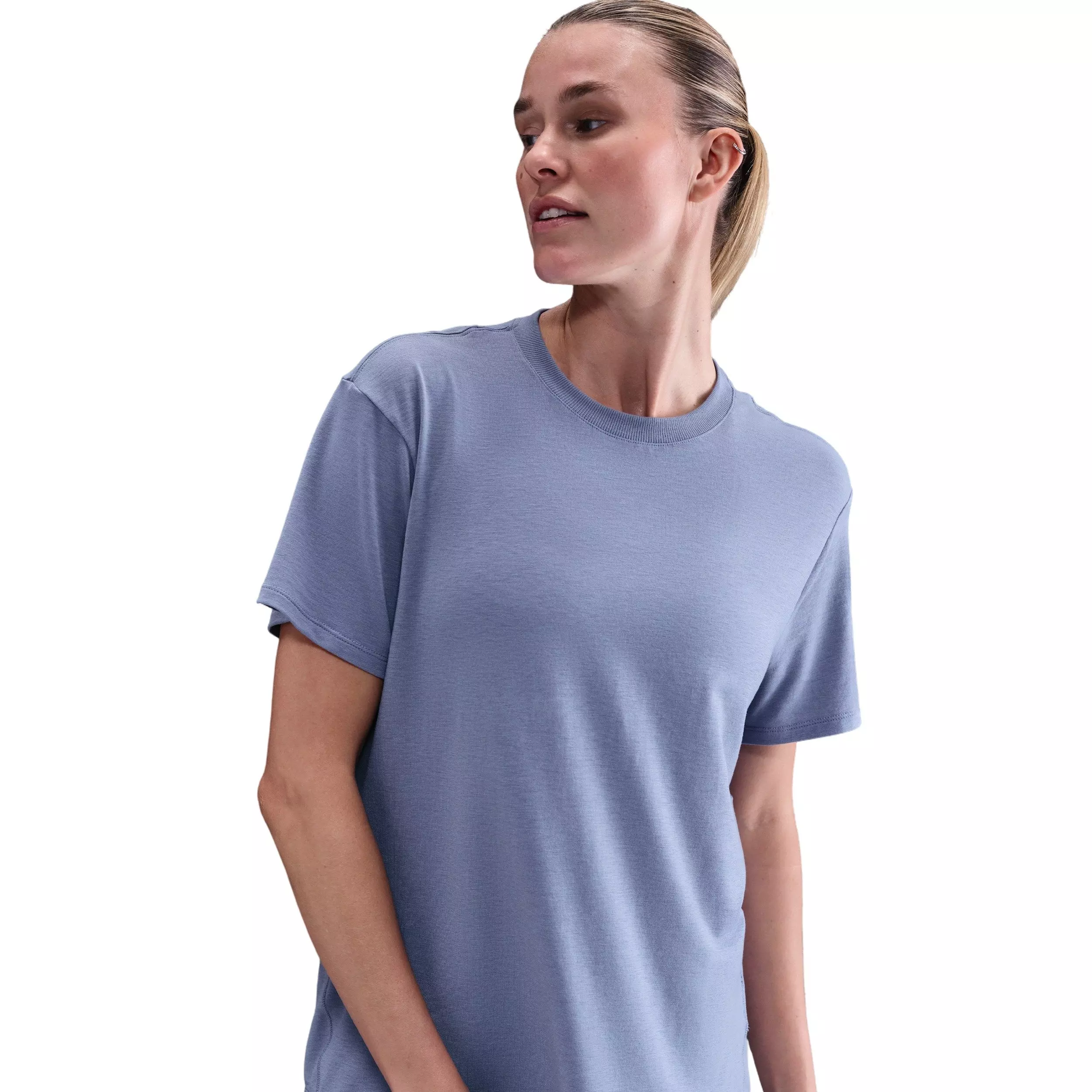 Up for a workout or down to chill, this indigo Nike One Women's Relaxed Dri-FIT Short-Sleeve Top is ready for whatever you are. Slightly textured, incredibly lightweight jersey fabric dries quickly and drapes you in comfort that goes with any activity. A loose, roomy fit and extended length help keep you covered and cozy from your morning stroll to your evening wind-down—and at all the stops in between.Features