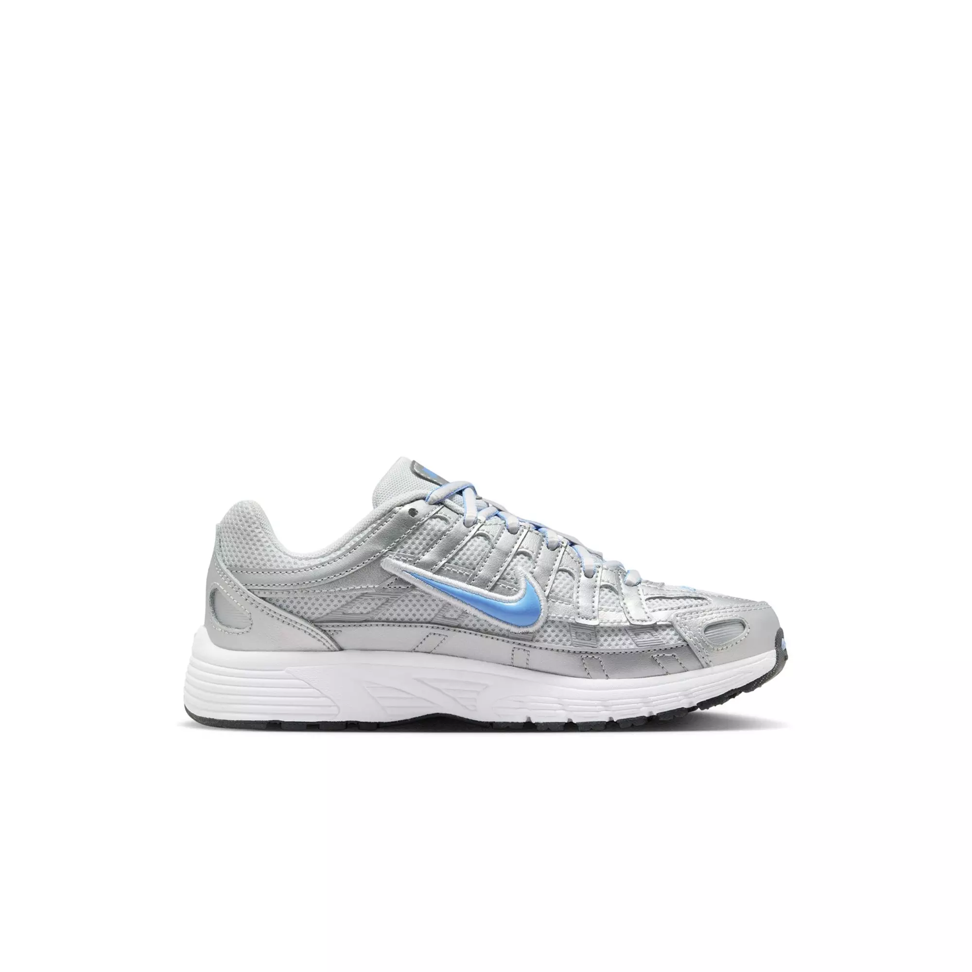 The Nike P-6000 "Mtlc Platinum/University Blue" Preschool Boys' Shoe draws inspiration from retro Pegasus sneakers. It brings a modern twist to early 2000s running style with a metallic platinum and university blue colorway.