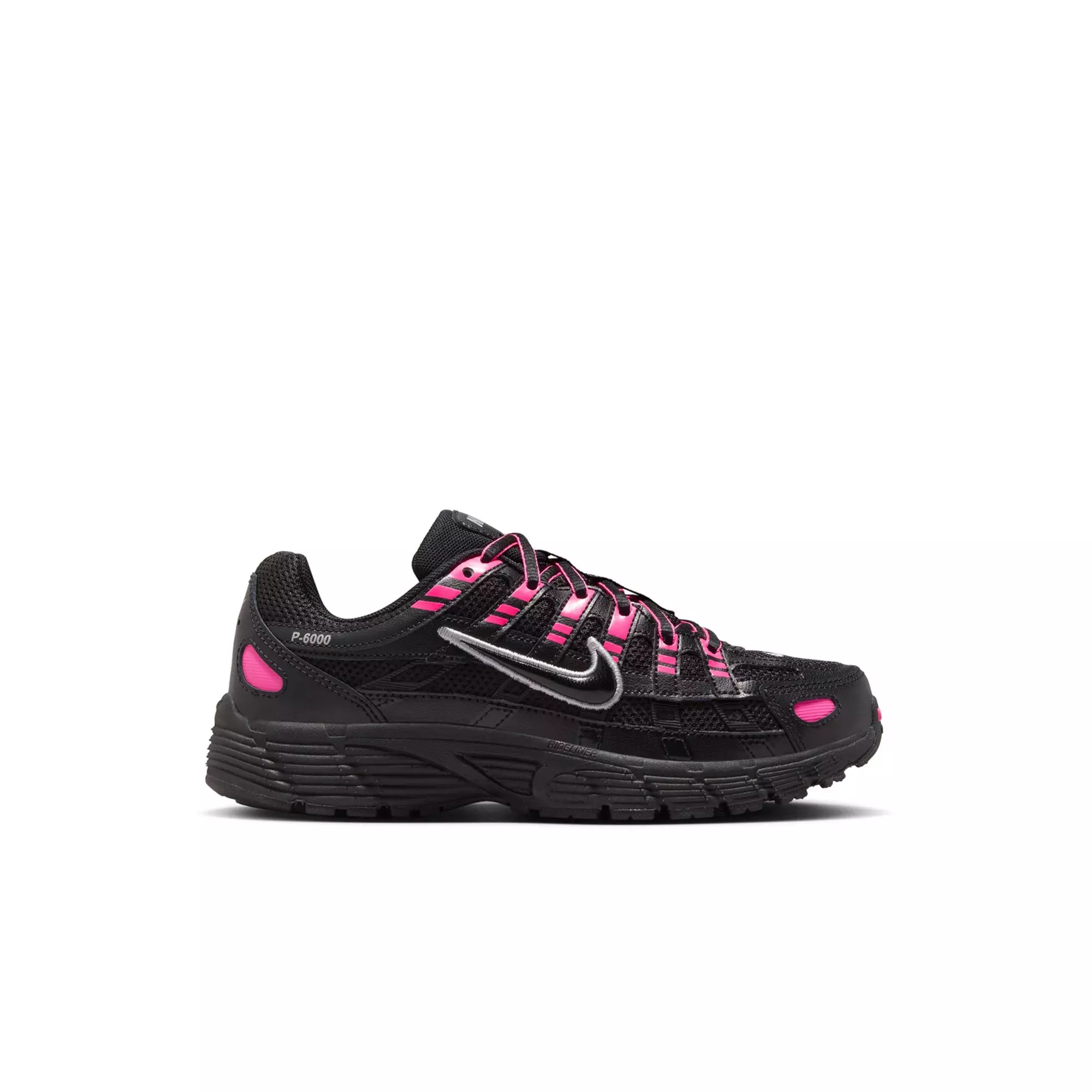 Inspired by retro Pegasus sneakers, the Nike P-6000 "Pink Blast/Metallic Silver/Black" Preschool Girls' Shoe modernizes early 2000s running style with a head-turning colorway, sporty design lines, and breathable textiles.