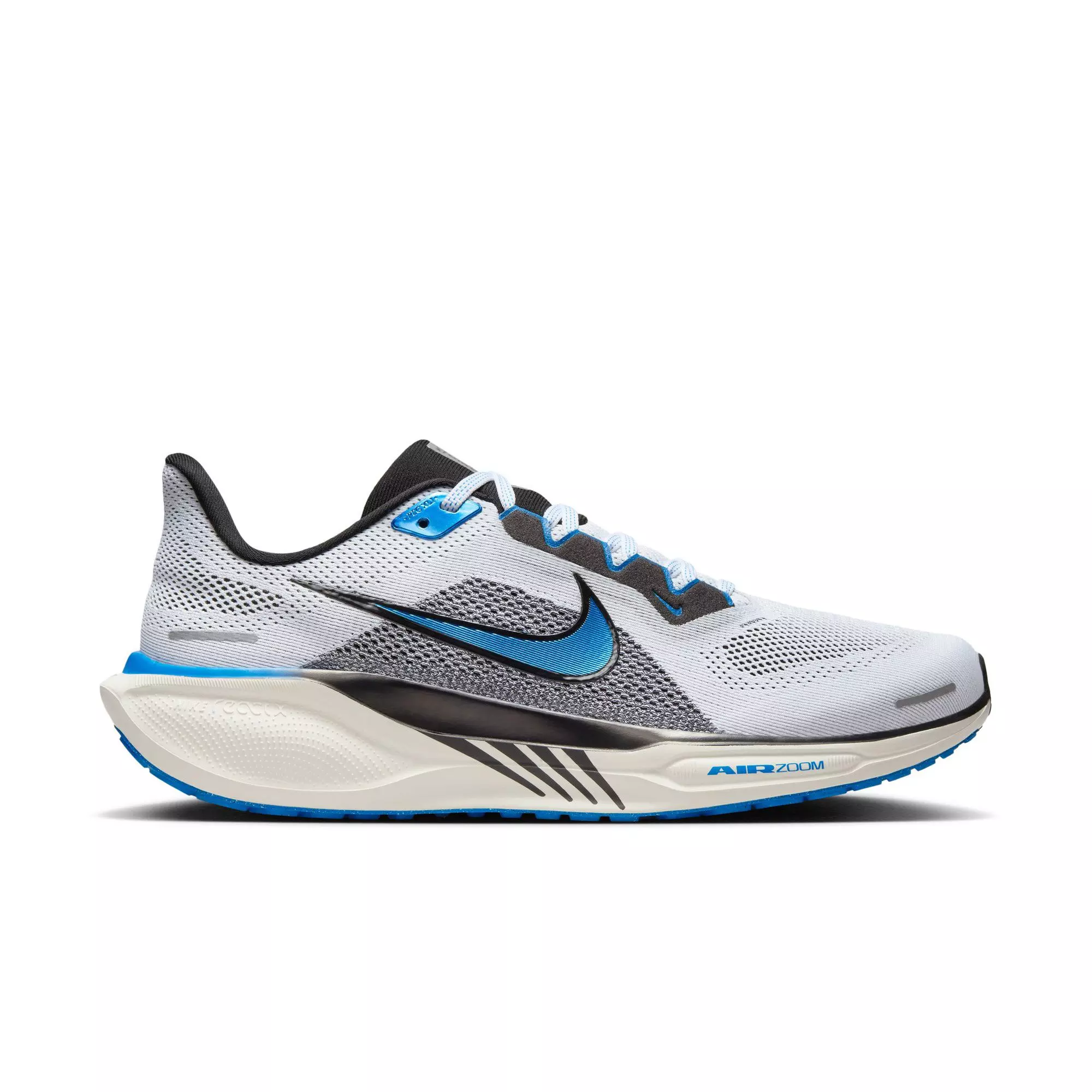 Responsive cushioning in the Nike Pegasus 41 "White/Photo Blue/Black/Sail" Men's Road Running Shoe delivers an energized ride during everyday road running. Lighter-weight, seamless energy return comes from dual Air Zoom units paired with a ReactX foam midsole.