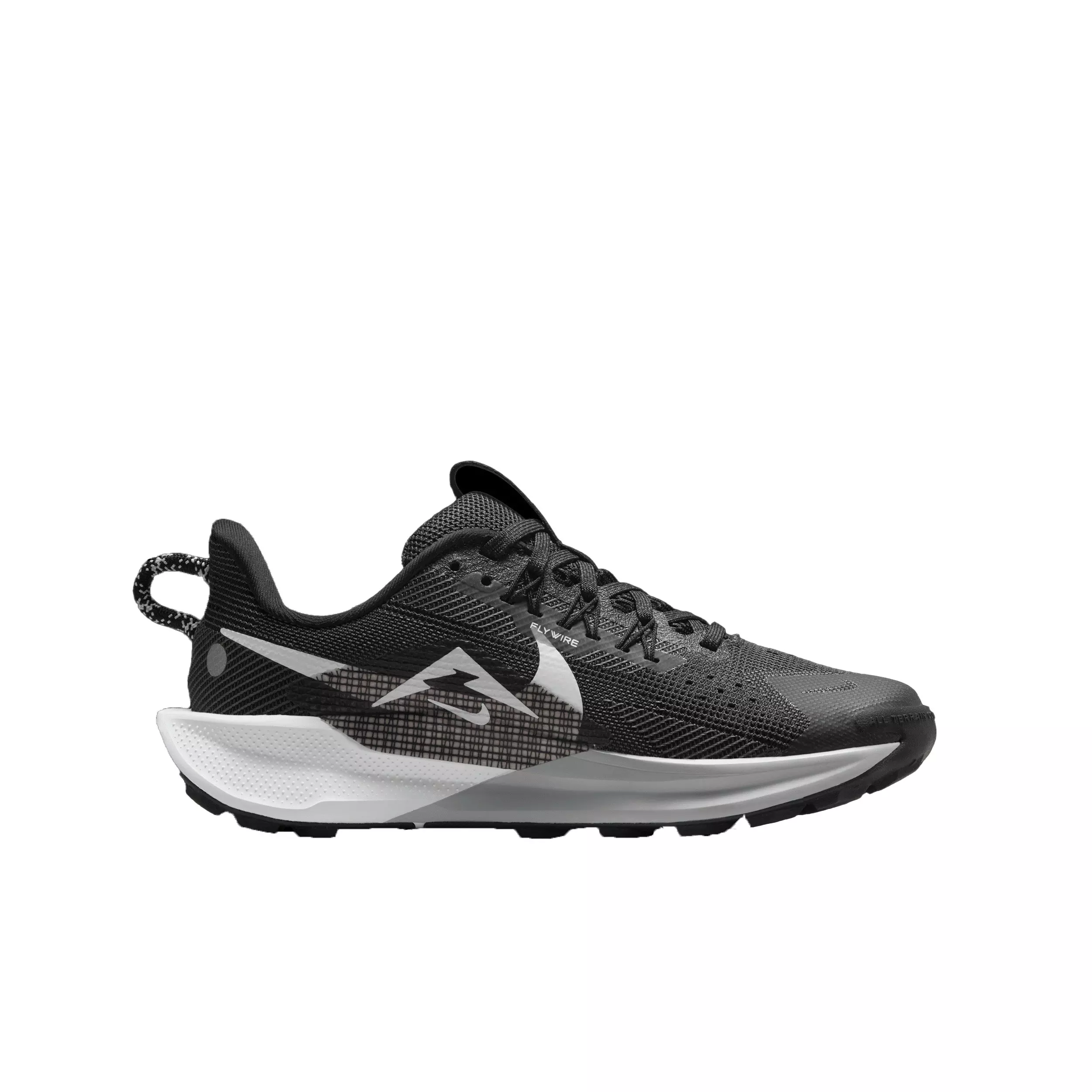 The Nike Pegasus Trail 5 "Black/Anthracite/Wolf Grey/White" Grade School Boys' Trail Running Shoe features a flexible, grippy outsole that bites into uneven terrain and gears you up to tackle rocky paths.