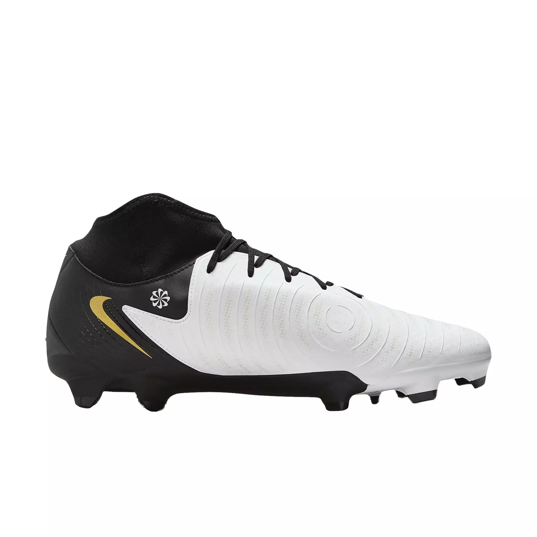 Looking to take your game to the next level? The Nike Phantom Luna 2 Academy MG "White/Metallic Gold Coin/Black" Men's Soccer Cleat helps put you in prime position of the net, whether you're the organizer, assister or finisher. The rest is up to you. Created with goals in mind, NikeSkin covers the striking area of the cleat while Nike Cyclone 360 traction helps guide your unscripted agility.Features