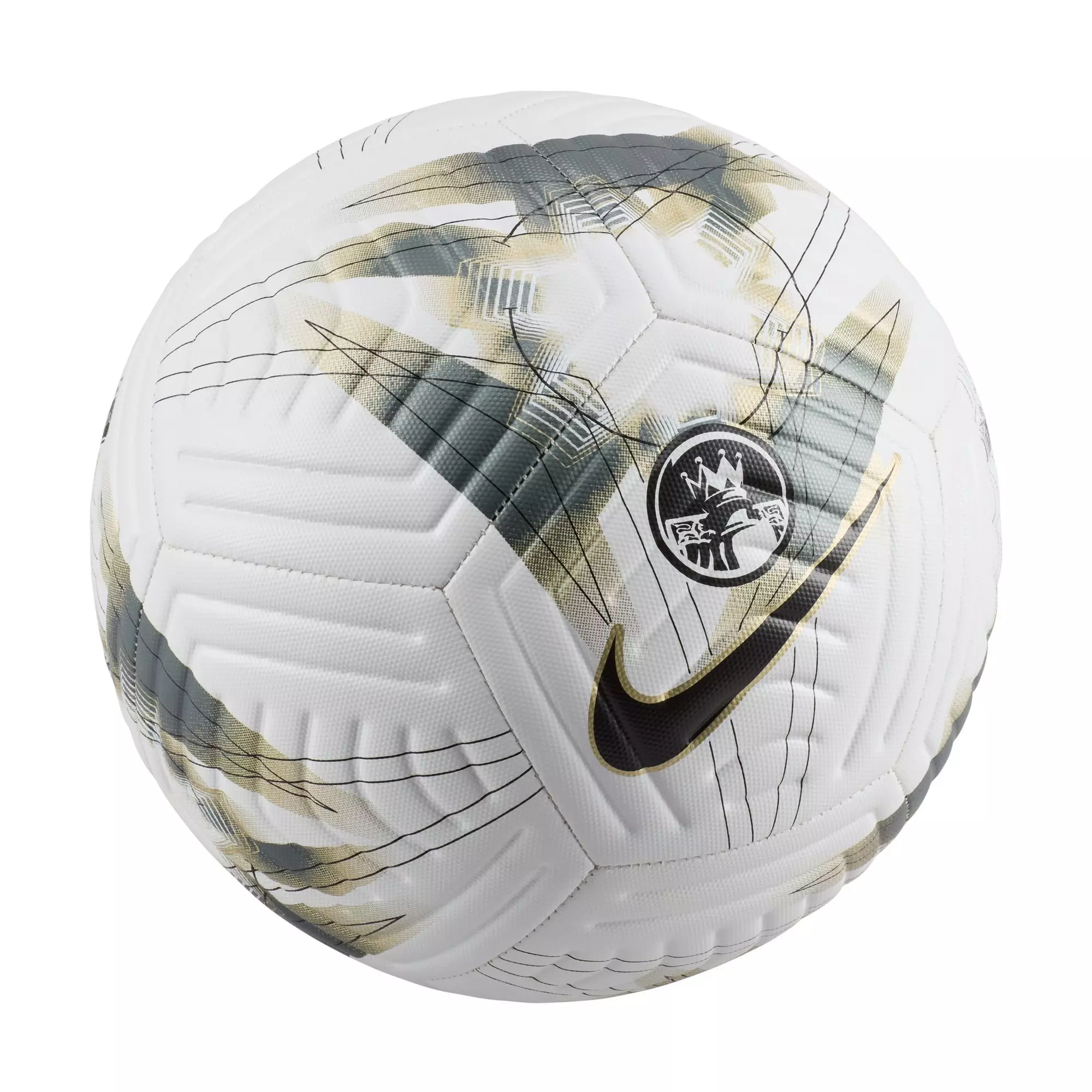 You never stop improving your skills, so use the Nike Premier League Academy Size 4 Soccer Ball - White/Metallic Gold Star/Black that works as hard as you do. The bright graphic features are easy to see on the pitch while you're practicing your footwork, and its innovative grooves create a consistent spin for that airborne shot towards the goal.Features