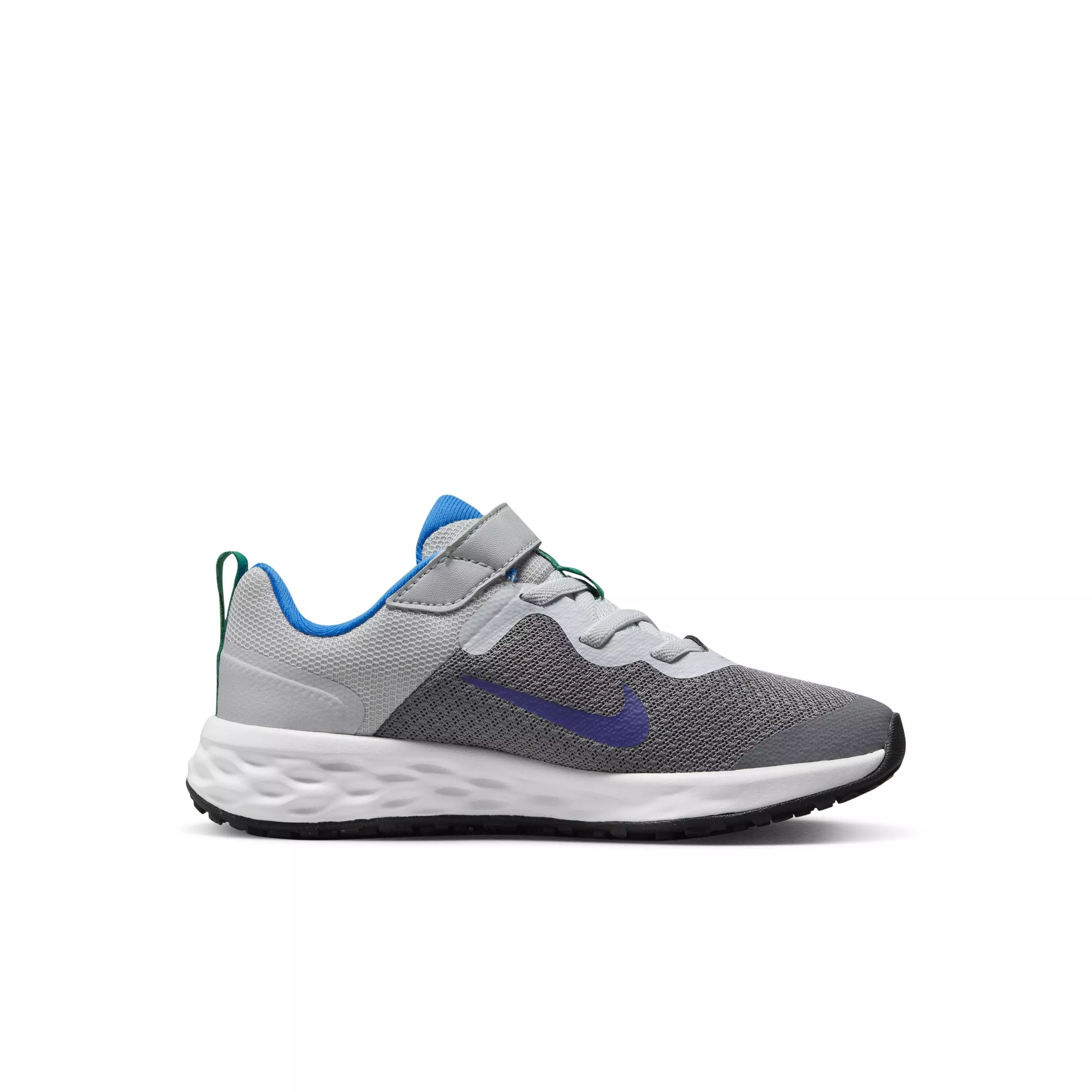 We prioritize comfort, especially for our growing athletes. Made with 20% recycled content by weight, you can take these lightweight, breathable Nike Revolution 6 "Cool Grey/Deep Royal Blue/Pure Platinum/Photo Blue" Preschool Boys' Running Shoe from all-day play to anytime wear and even track practice. Lightweight, breathable and cushioned for growing feet, the race starts now.Features