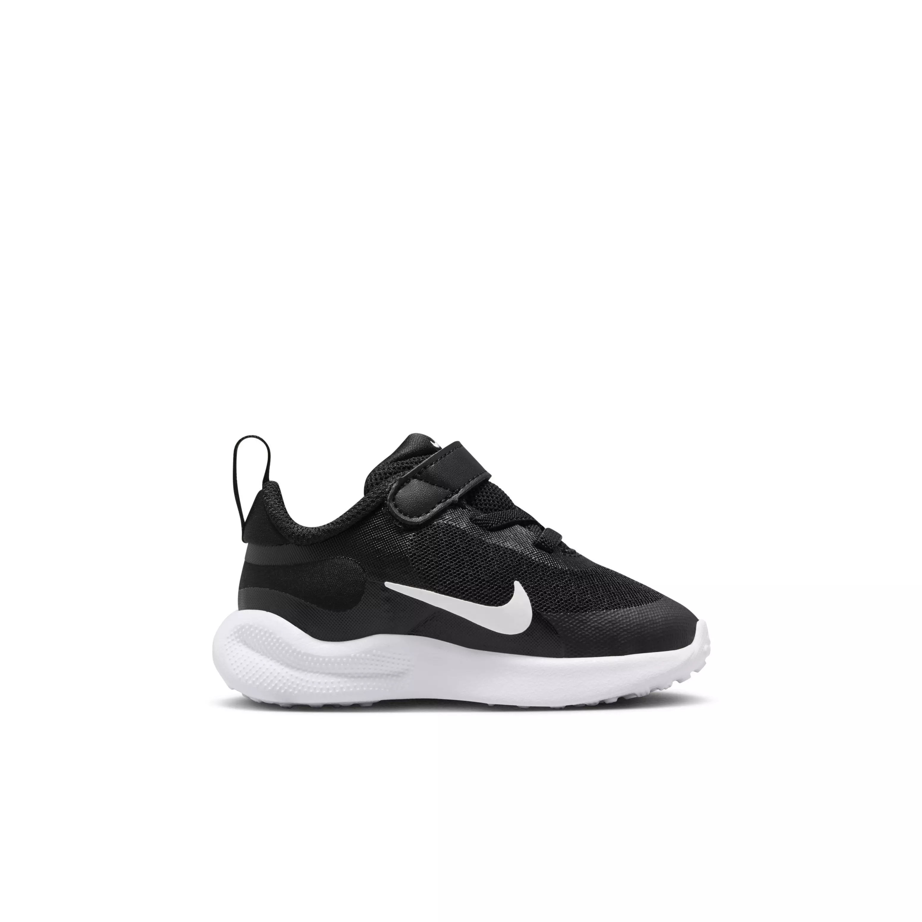 The Nike Revolution 7 "Black/White/White" Infant Boys' Running Shoe blends soft foam cushioning and a flexible rubber outsole to support tiny strides. Designed with vibrant patterns to spark early curiosity.