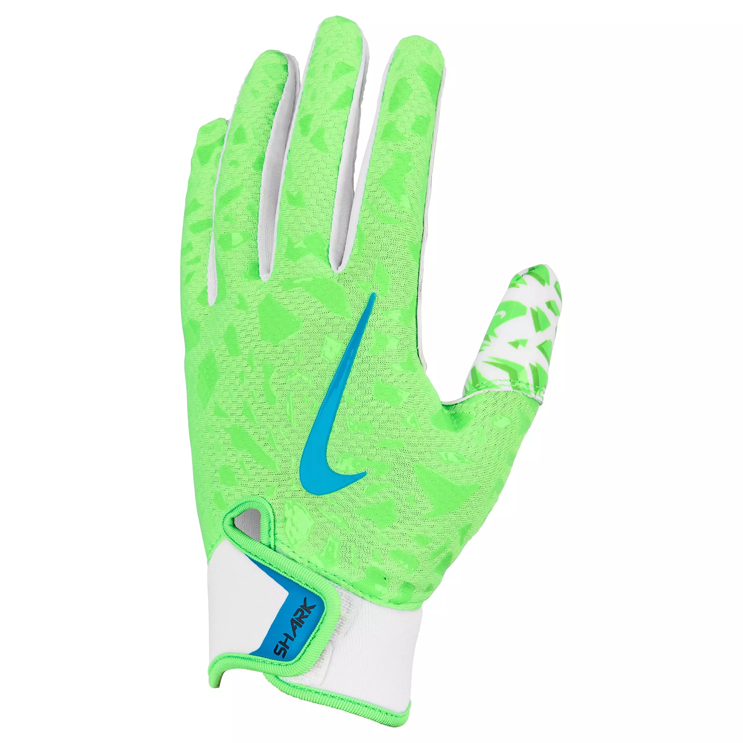 The Nike Shark 2.0 PeeWee Football Receiver Gloves - Green/White feature sticky Magnigrip palms that secure the ball on impact. The lightweight, stretchy fit enhances hand movement and stability. An ergonomic backhand design maintains a sleek profile without adding bulk.