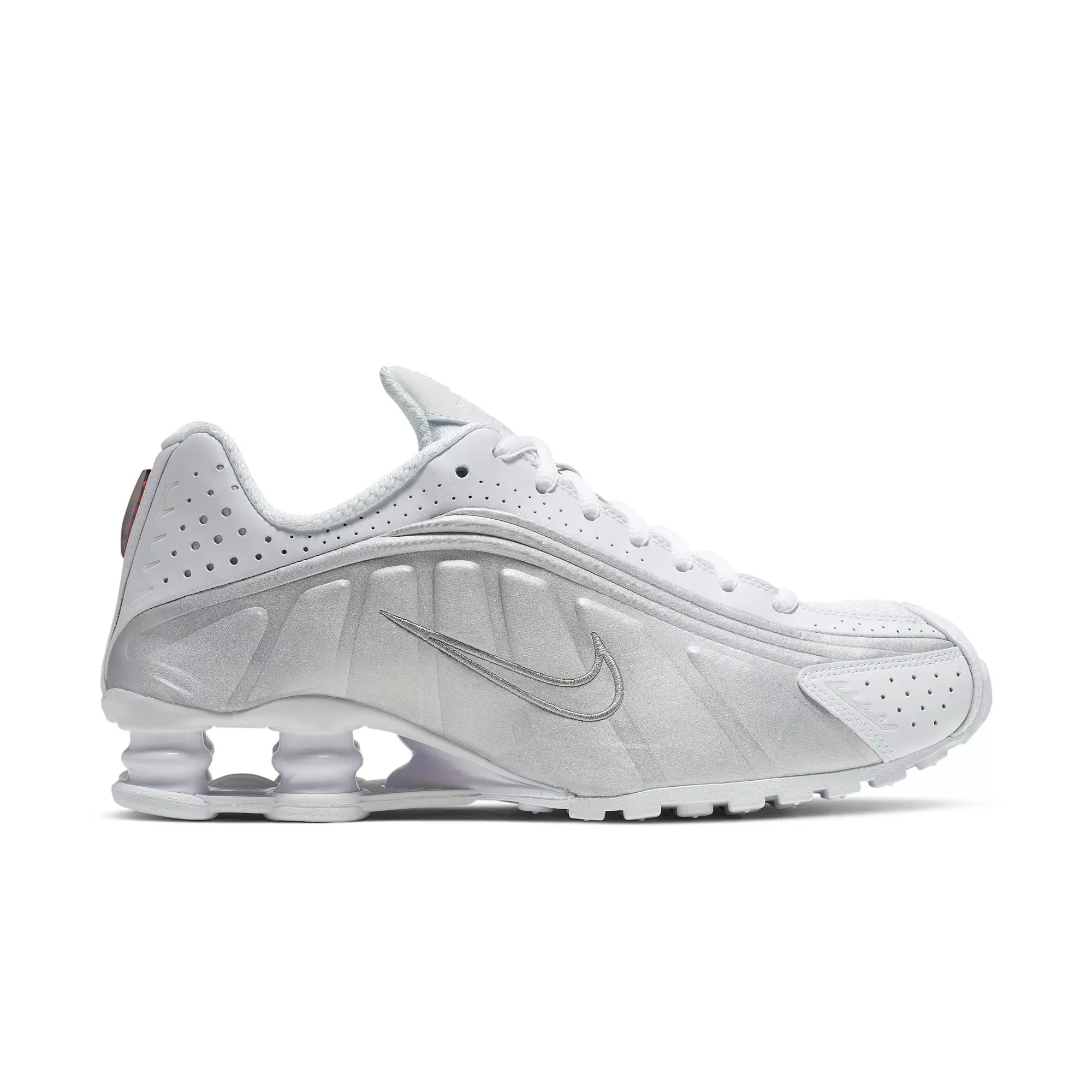 The Nike Shox R4 "White/Metallic Silver/Max Orange" Women's Shoe revives the 2001 icon with its synthetic and textile upper, signature design lines and precise laser perforations. This recrafted silhouette replicates the original shape and captures its timeless appeal.