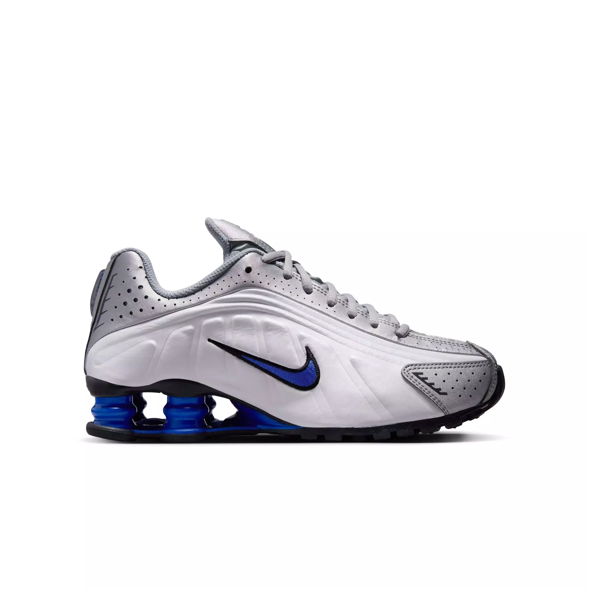 The Nike Shox R4 "White/Metallic Silver/Racer Blue" Grade School Boys' Shoe features durable synthetic leather with perforations to ventilate and boost airflow. Neon details accent metallic silver and racer blue panels. A sturdy rubber outsole offers reliable traction on diverse surfaces.
