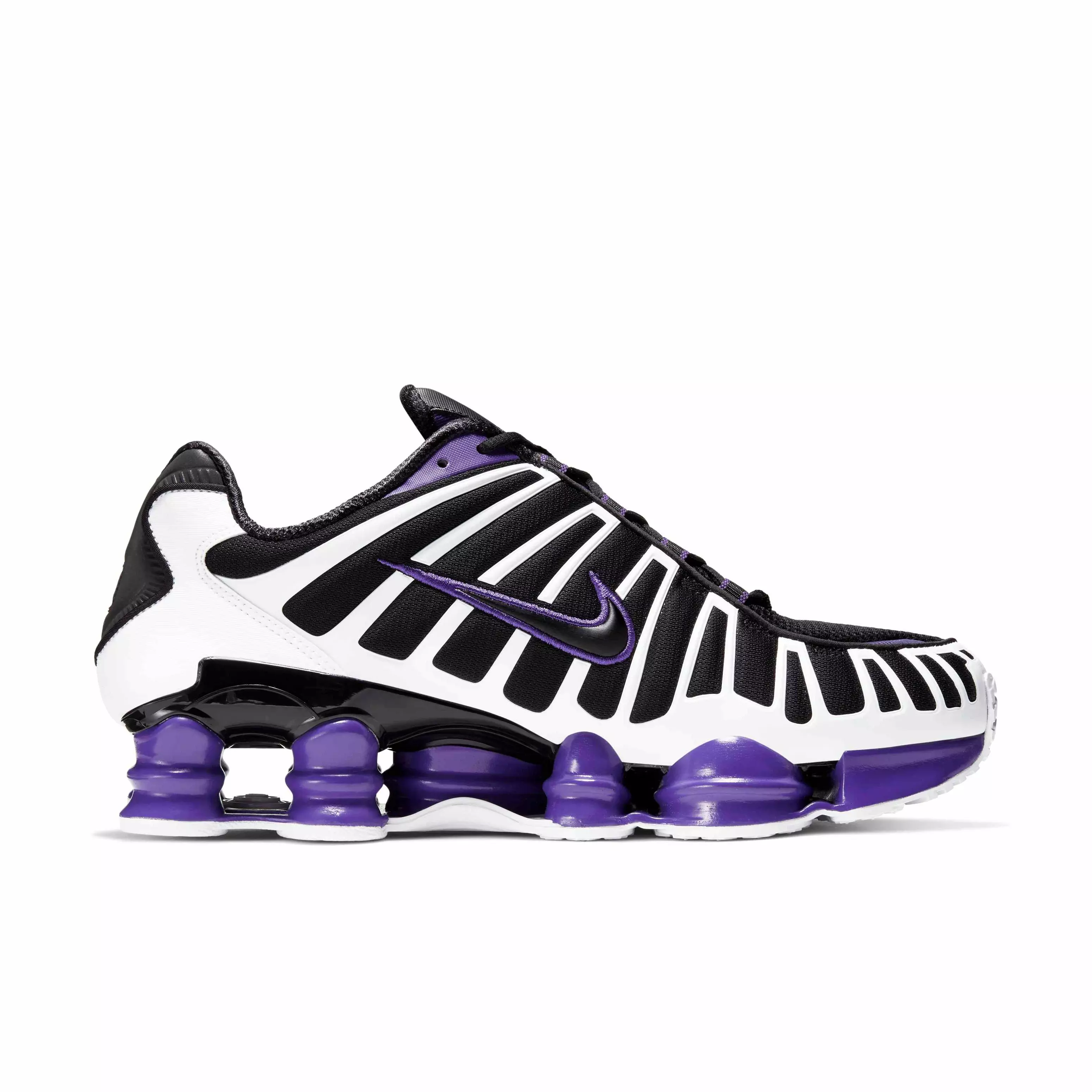 The Nike Shox TL "Black/White/Court Purple" Men's Shoe takes mechanical cushioning to the next level. A recrafted version of the 2003 icon, it features breathable mesh in the upper and full-length Nike Shox technology for optimal impact absorption and a bold look on the streets.Features