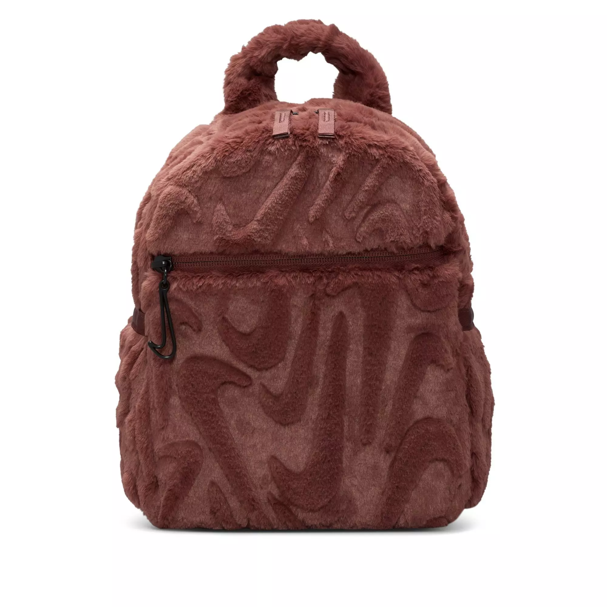 The Nike Sportswear Futura Faux Mini Backpack-Maroon features soft faux fur and a front zipped pocket that secures small essentials. It offers easy access to items on the go.