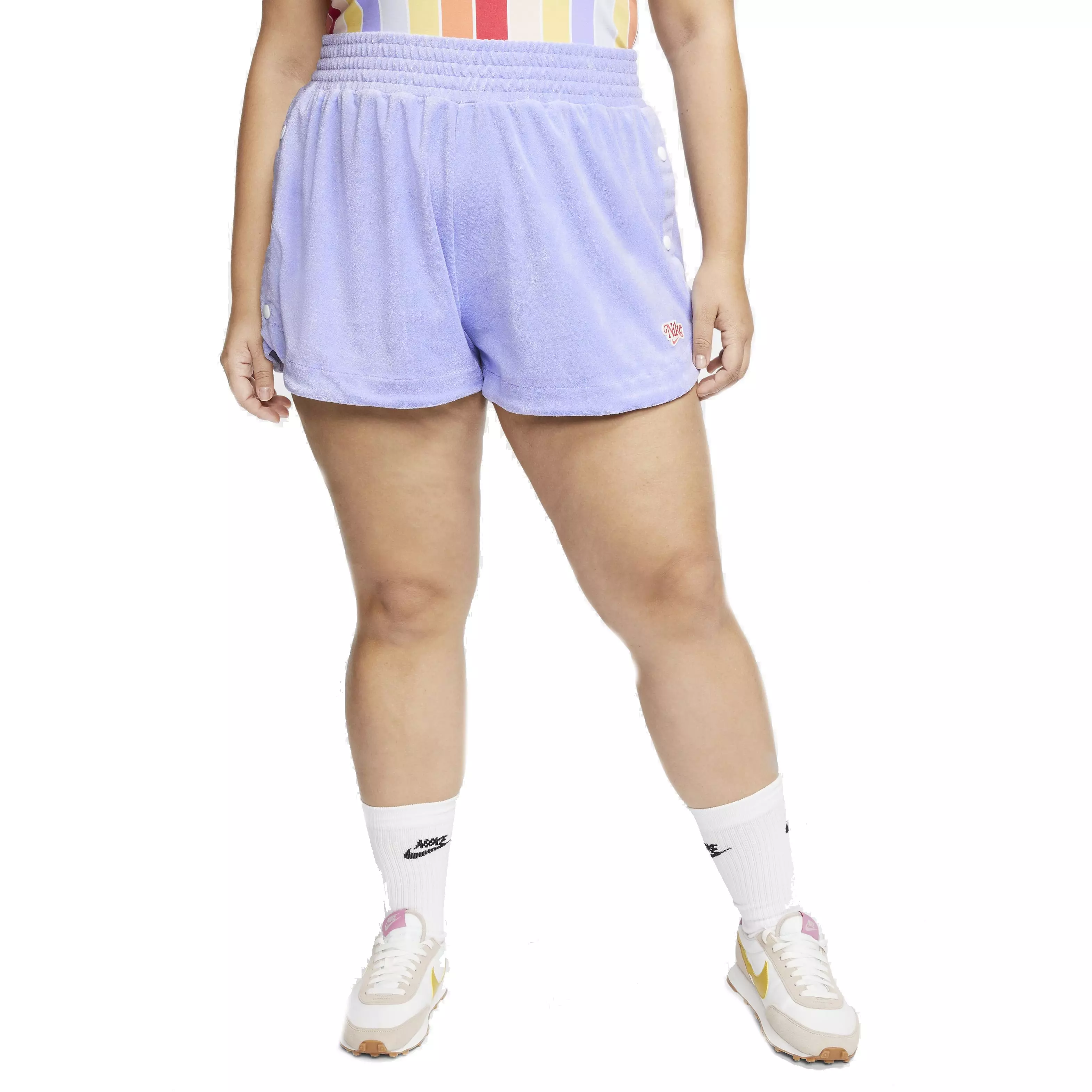 These Nike Sportswear Women's Light Purple Plus Size Shorts are inspired by retro warm-ups. These short and snappy shorts are made with a smooth cotton blend that soft and comfortable. Snap closures at the sides rep retro b-ball heritage.