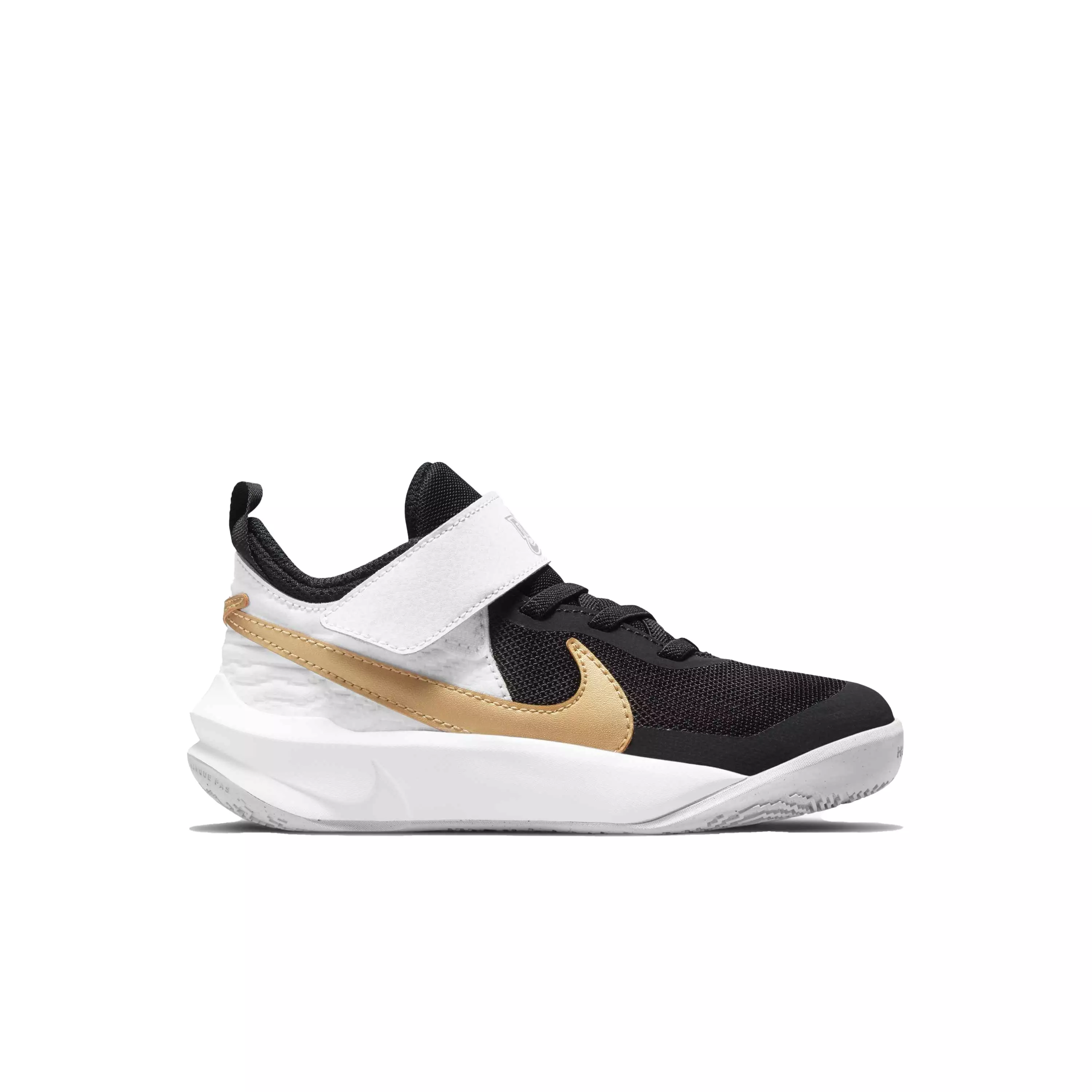 For every hop, skip and jump, the Nike Team Hustle D 10 "Black/Metallic Gold/White/Photon Dust" Preschool Boys' Basketball Shoe is an easy slam dunk for future players. With a traction pattern tailored for kiddos, soft cushioning and a design that’s durable and supportive—these basketball-inspired shoes are a major score for future all-stars ready to crush it at playtime (and hoops, of course).Features