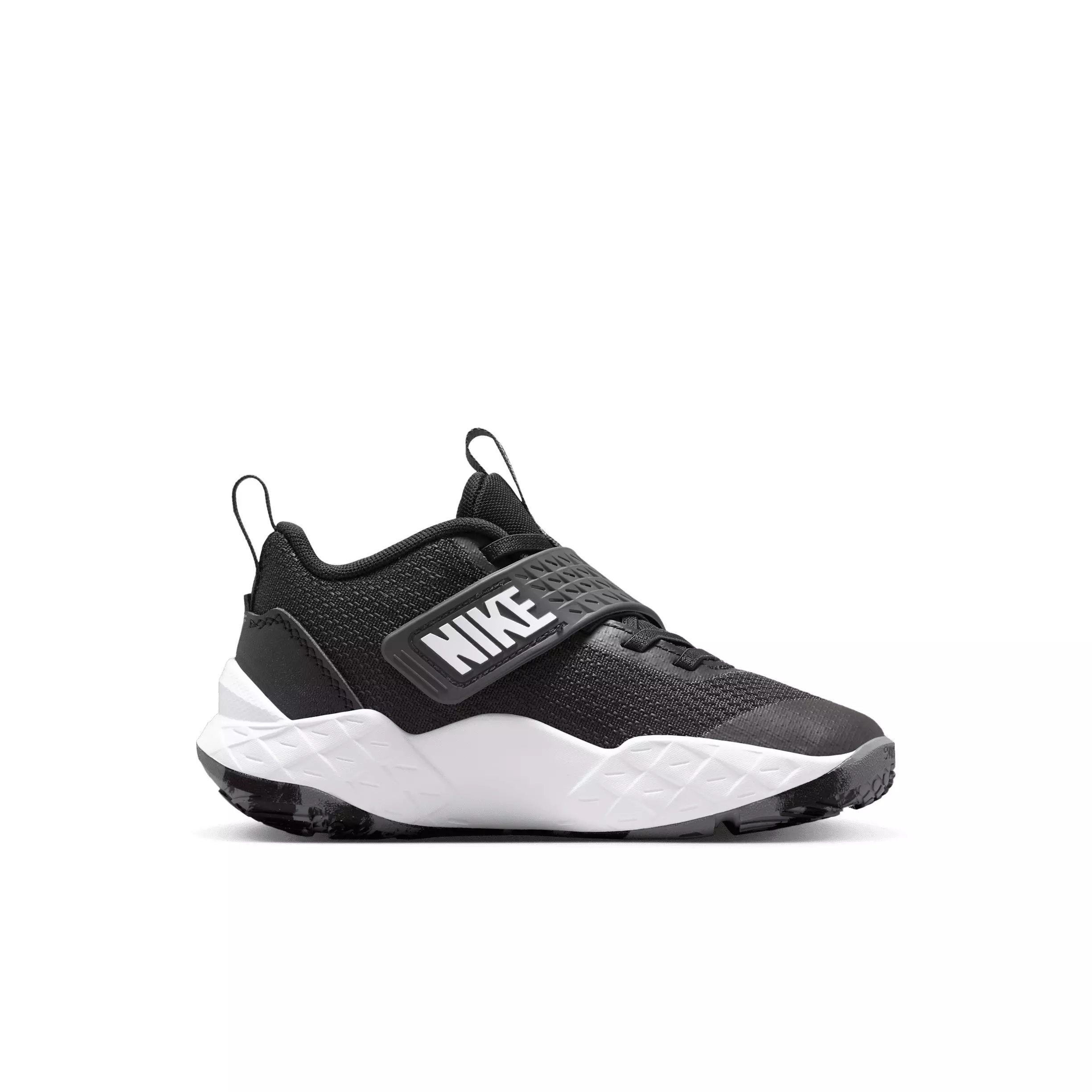 The Nike Team Hustle D 12 "Black/Anthracite/White" Preschool Boys' Basketball Shoe delivers easy comfort for active kids. A hook-and-loop strap over elastic laces secures the foot quickly, while a breathable mesh upper with durable overlays stands up to school days and pickup games alike.