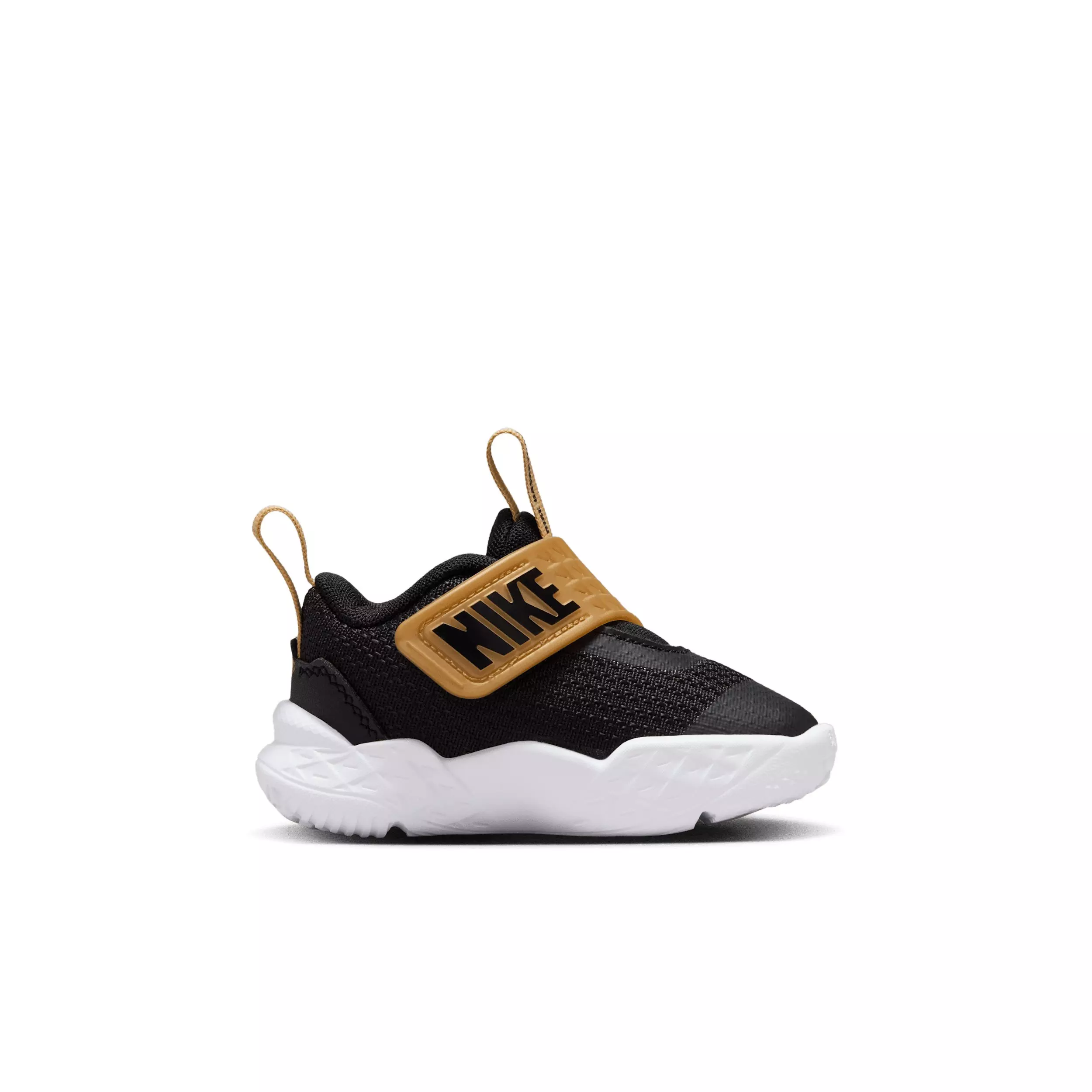 The Nike Team Hustle D 12 "Black/Metallic Gold/White/Black" Infant Boys' Basketball Shoe is made for kids who love to hoop. Its strap closure system makes it easy to secure your fit fast. Underfoot, plush foam and a durable rubber outsole give you the cushioning and grip you need to confidently play on outdoor courts.Features