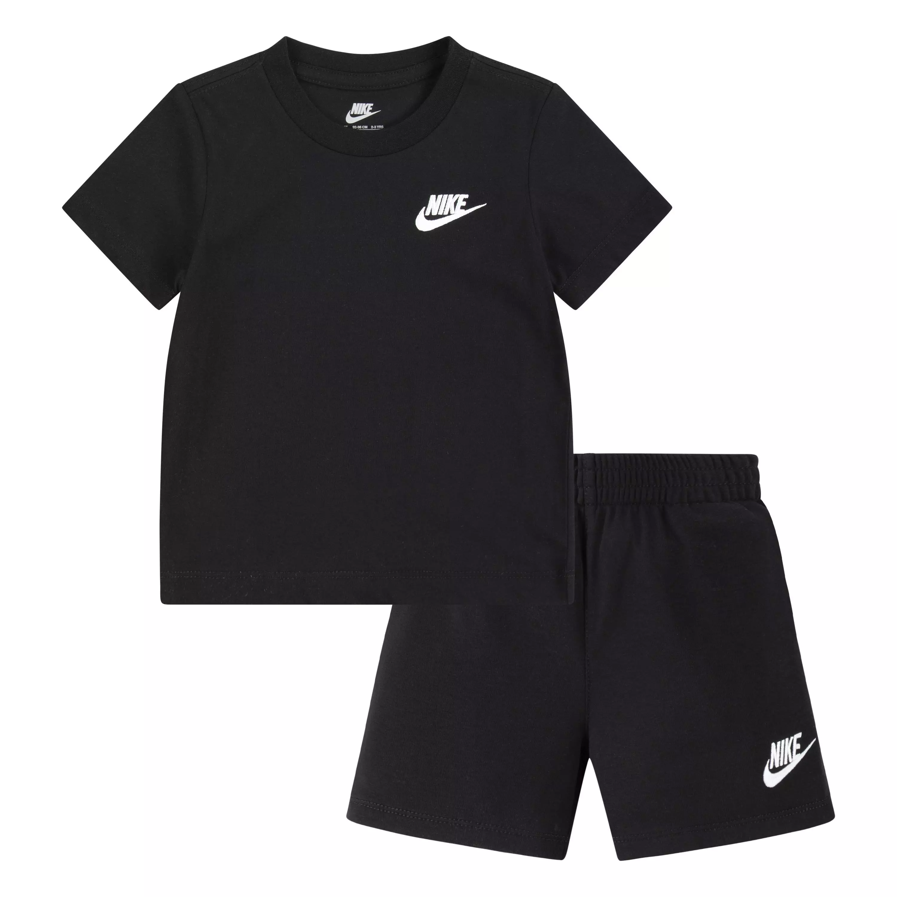 Nike Toddler Boys' Knit Short Set - Black features a jersey knit tee that feels smooth against the skin. The tagless crewneck pulls on easily, offering a smooth fit.