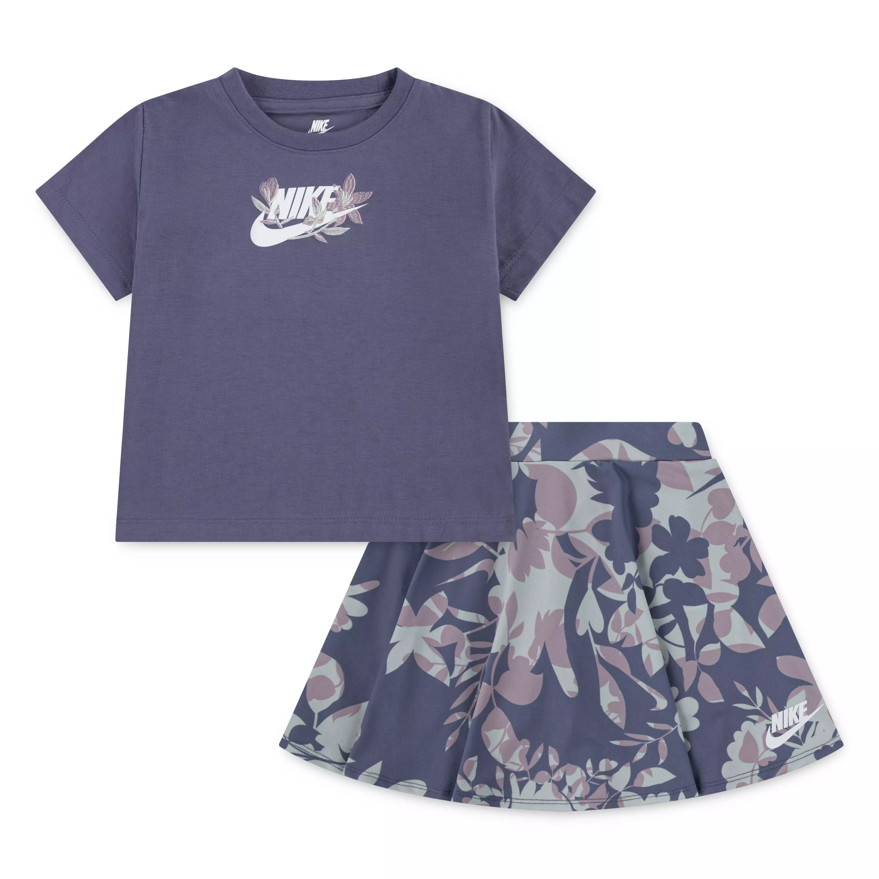The Nike Toddler Girls' Club Scooter Skort Set keeps playtime easy and stylish. The tee features a classic silhouette with a tagless crewneck for fuss-free comfort. Soft, stretchy poly knit jersey with quick-drying, moisture-wicking Dri-FIT technology helps little ones stay cool and dry from warm-ups to wind-downs.
