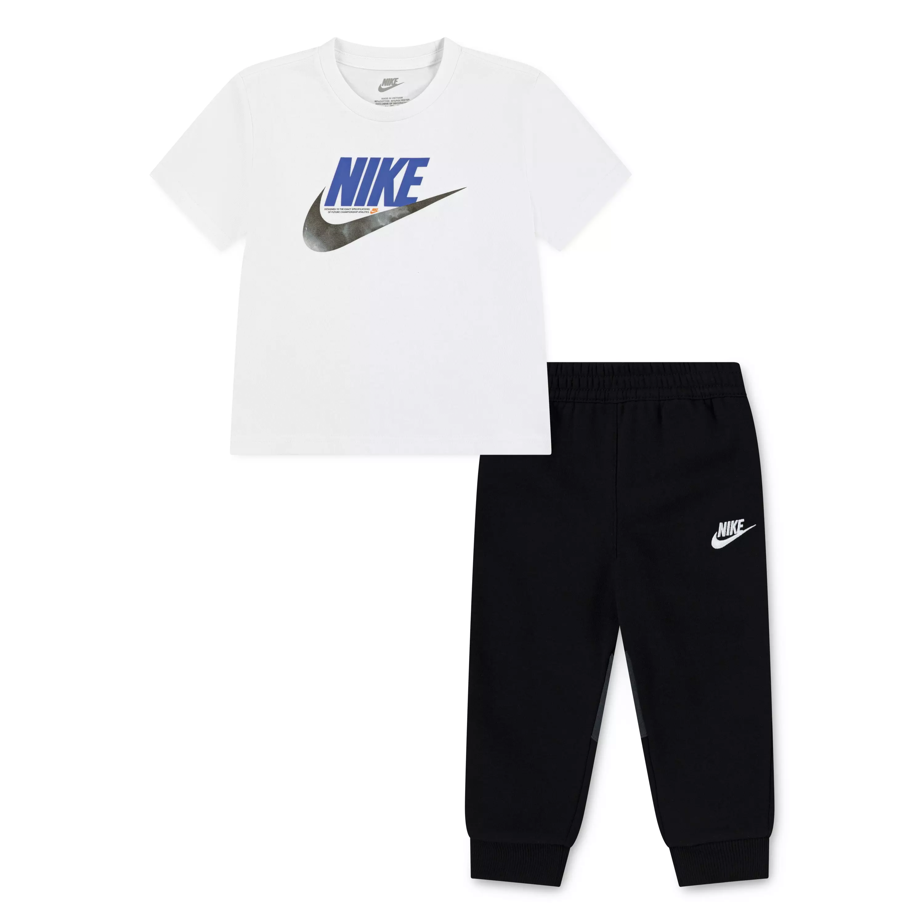 Designed for easy play, the Nike Toddler Kids' Jogger Set - White/Black keeps little ones comfy from crawl to playground. The soft jersey knit top feels smooth against skin, while the tagless crewneck makes dressing simple and irritation-free.