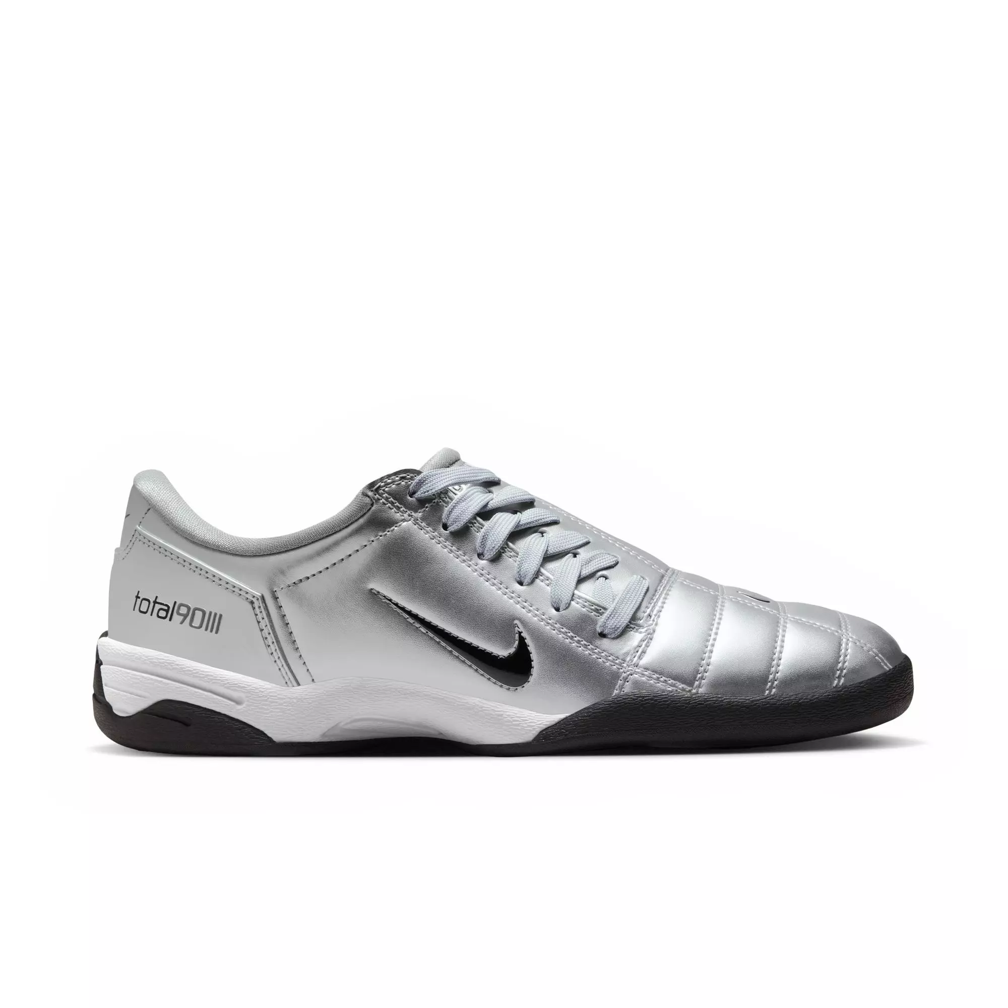 Authentic soccer style, now made for every day. The Nike Total 90 "Metallic Silver/Black/University Red" Women's Shoe revives Y2K energy with its quilted upper and asymmetrical lacing reimagined for the street. A flat rubber sole replaces the cleats for smooth traction and daily comfort.