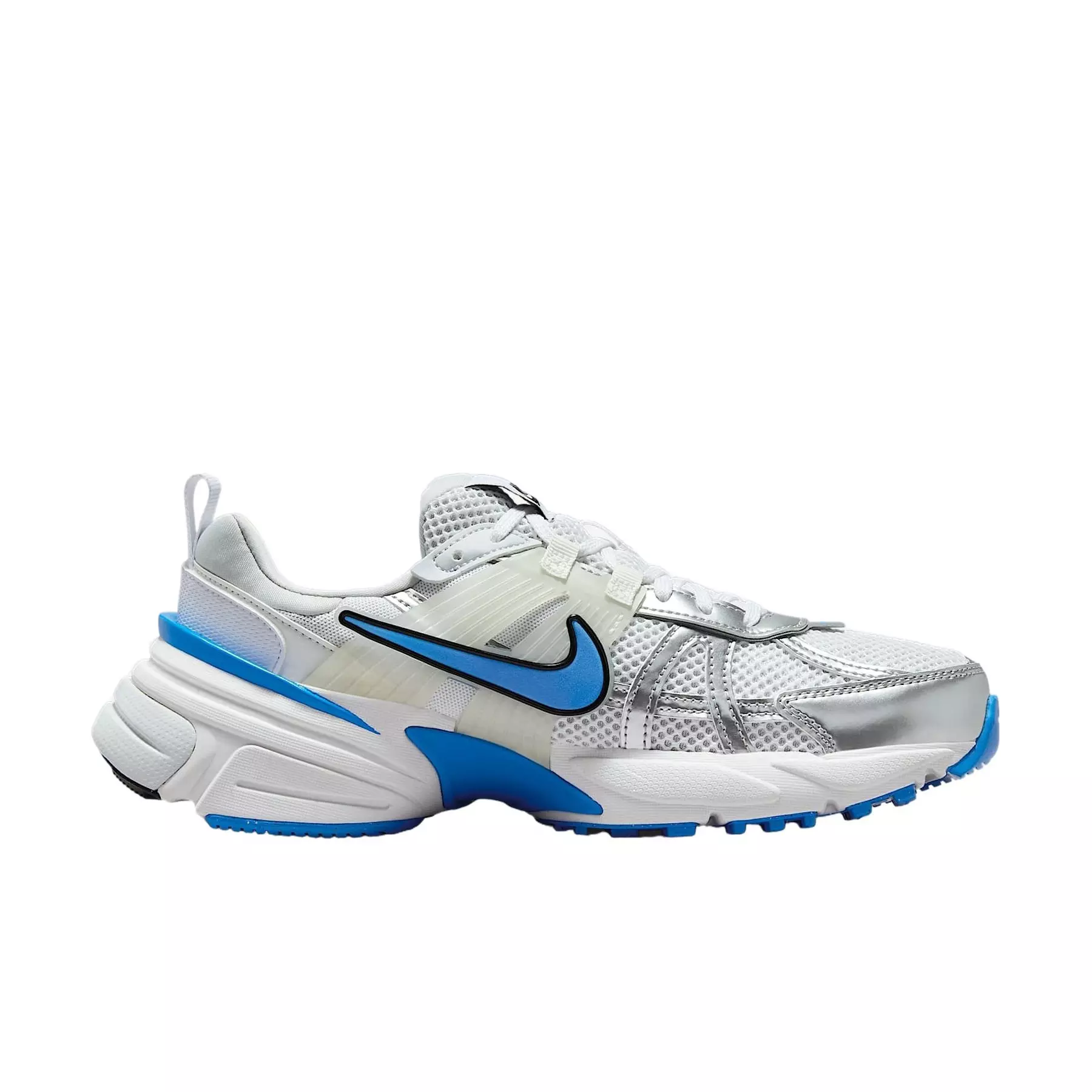 Fast forward. Rewind. Doesn’t matter—this shoe takes retro into the future. The Nike V2K Run "White/Pure Platinum/Summit White/Light Photo Blue" Women's Shoe remasters everything you love about the Vomero in a look pulled straight from an early aughts running catalog. Layer up in a mixture of flashy metallics, referential plastic details and a midsole with a perfectly vintage aesthetic. And the chunky heel makes sure wherever you go, it's in comfort.Features