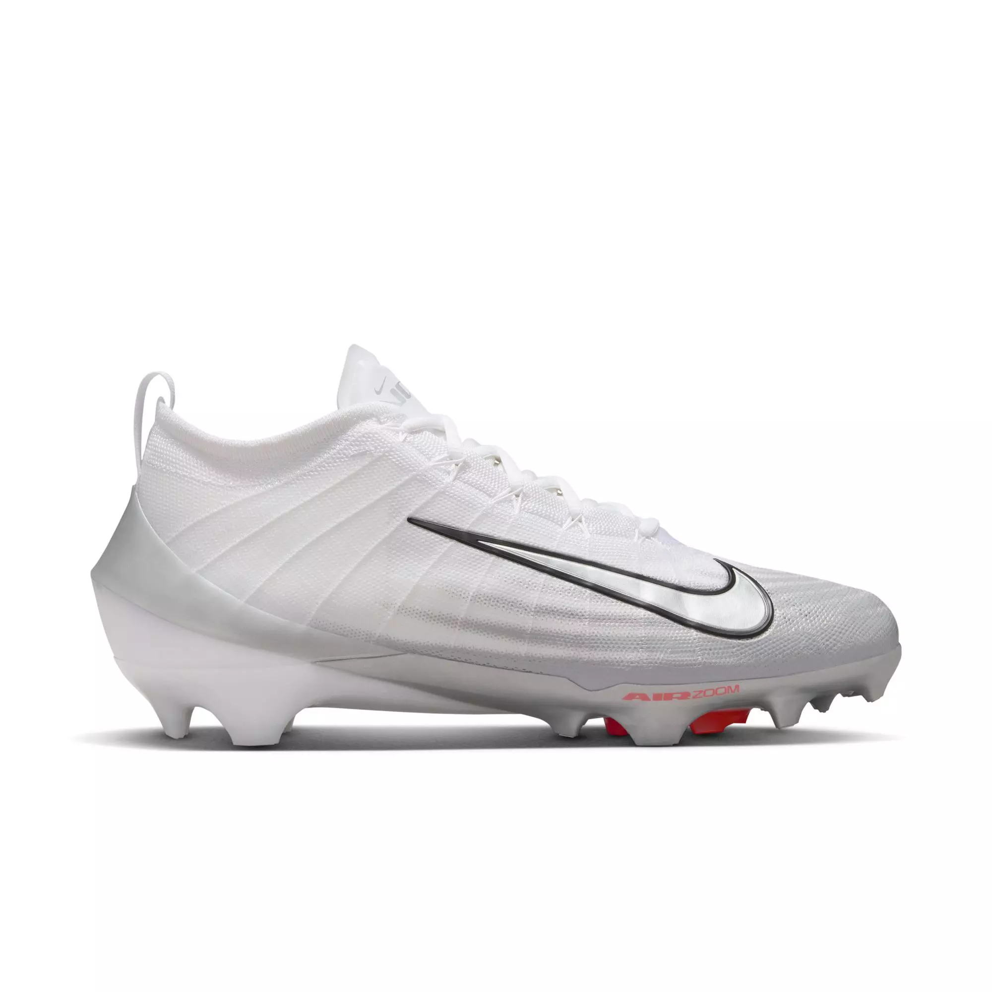 The Nike Vapor Elite 1 "White/Metallic Silver/Summit White" Men's Football Cleat features an ultra-light upper that moves with your foot like a second skin, allowing unrestricted mobility. This streamlined construction helps reduce drag for faster performance on the field.