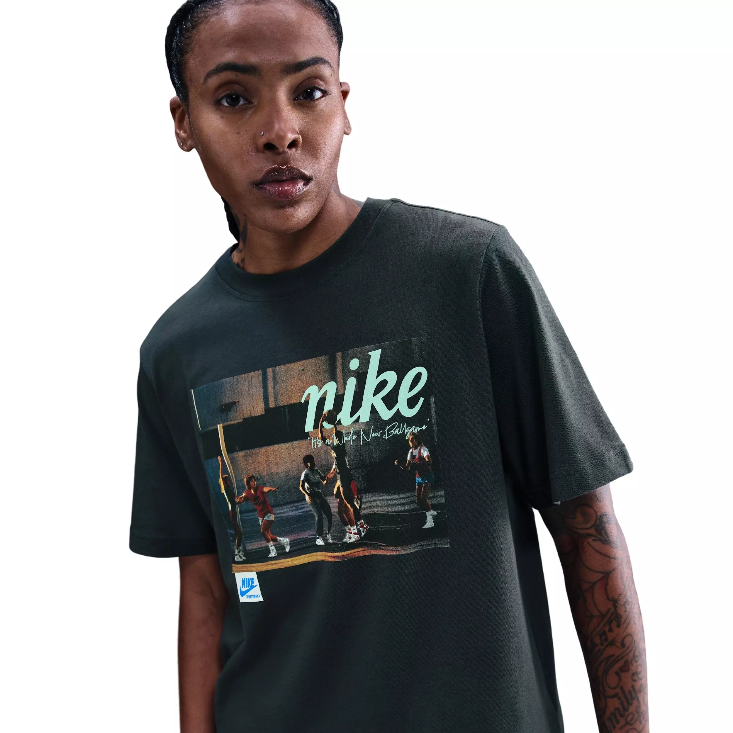 Make your move in the Nike Women's Basketball Photo Tee -Seaweed Green, a casual layer built for comfort on and off the court. The roomy silhouette lets you shoot, pass, and relax without restriction, while the seaweed green hue pairs easily with your favorite hoops gear.