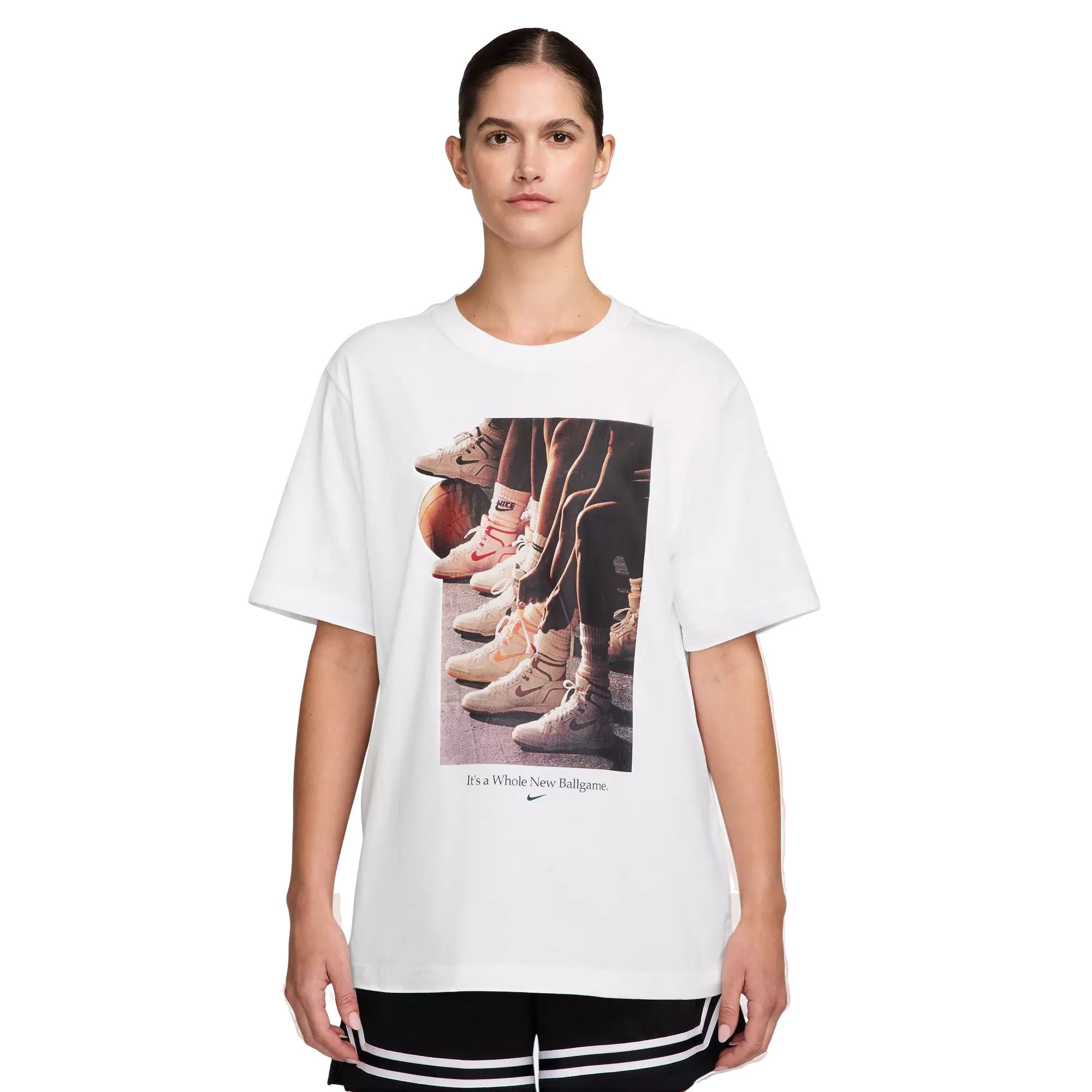 The Nike Women's Basketball Short-Sleeve Tee features midweight cotton fabric that feels soft with a slightly textured finish. Its loose cut delivers a roomy, comfortable silhouette that stays relaxed throughout wear. Midweight cotton locks in gentle comfort without added bulk.