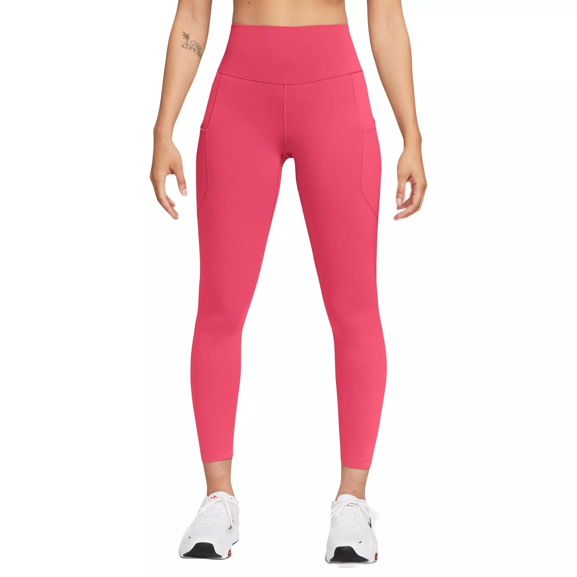 Up for a workout or down to chill—the Nike Women's Dri-FIT One Pocket 7/8 Tight - Pink are ready for whatever you are. Super soft fabric stretches with your every move while sweat-wicking tech helps keep you comfortable and dry. You can stash your essentials in the 2 drop-in side pockets and the pocket at the waistband. Plus, keep your butt covered with nonsheer fabric so you stay confident in your deepest bend.Features
