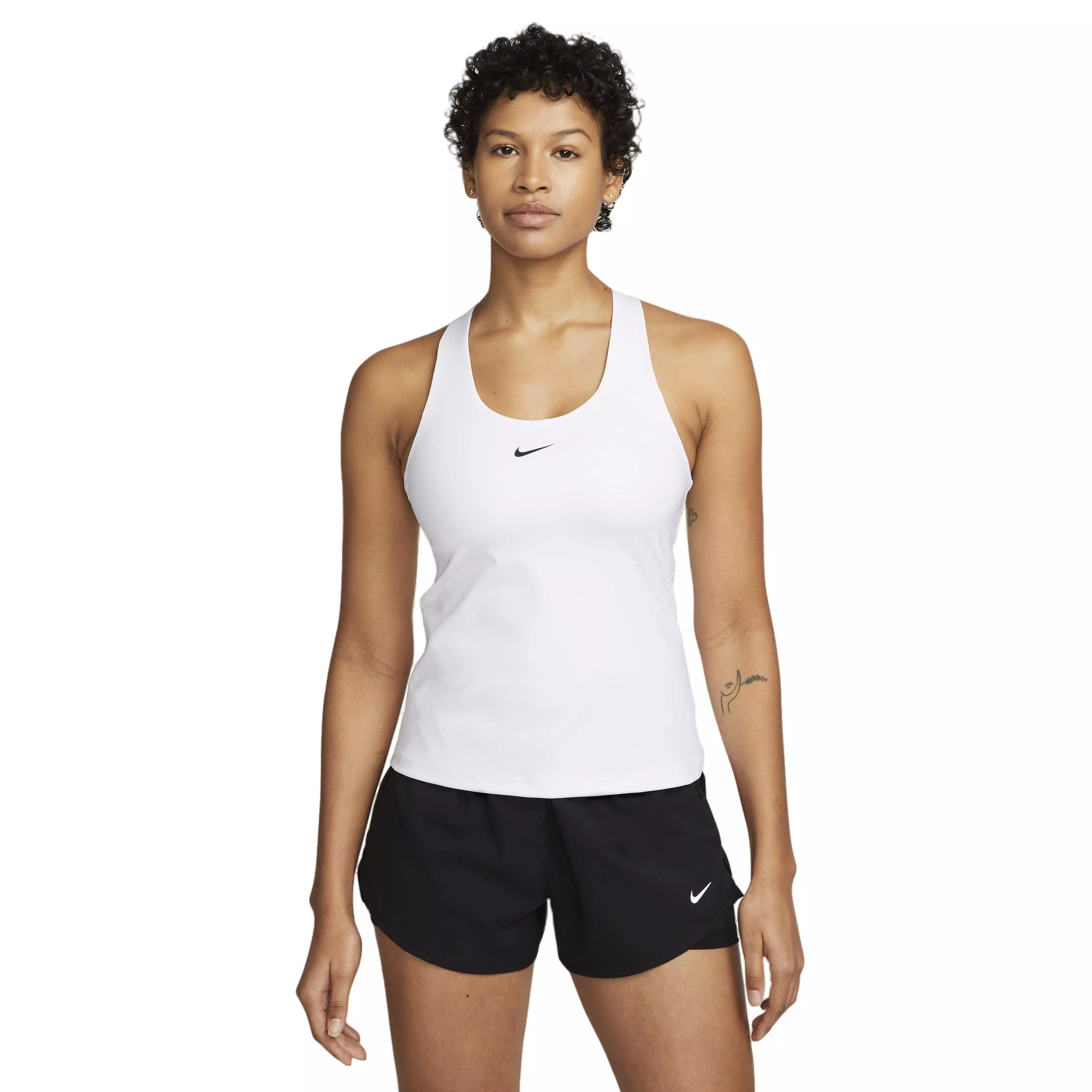 The Nike Women's Dri-FIT Swoosh Padded Sports Bra Tank-Black uses smooth, stretchy Dri-FIT fabric that hugs your shape as you move from office to gym and back. Sewn-in padding and a racerback silhouette secure your fit and keep cups in place.