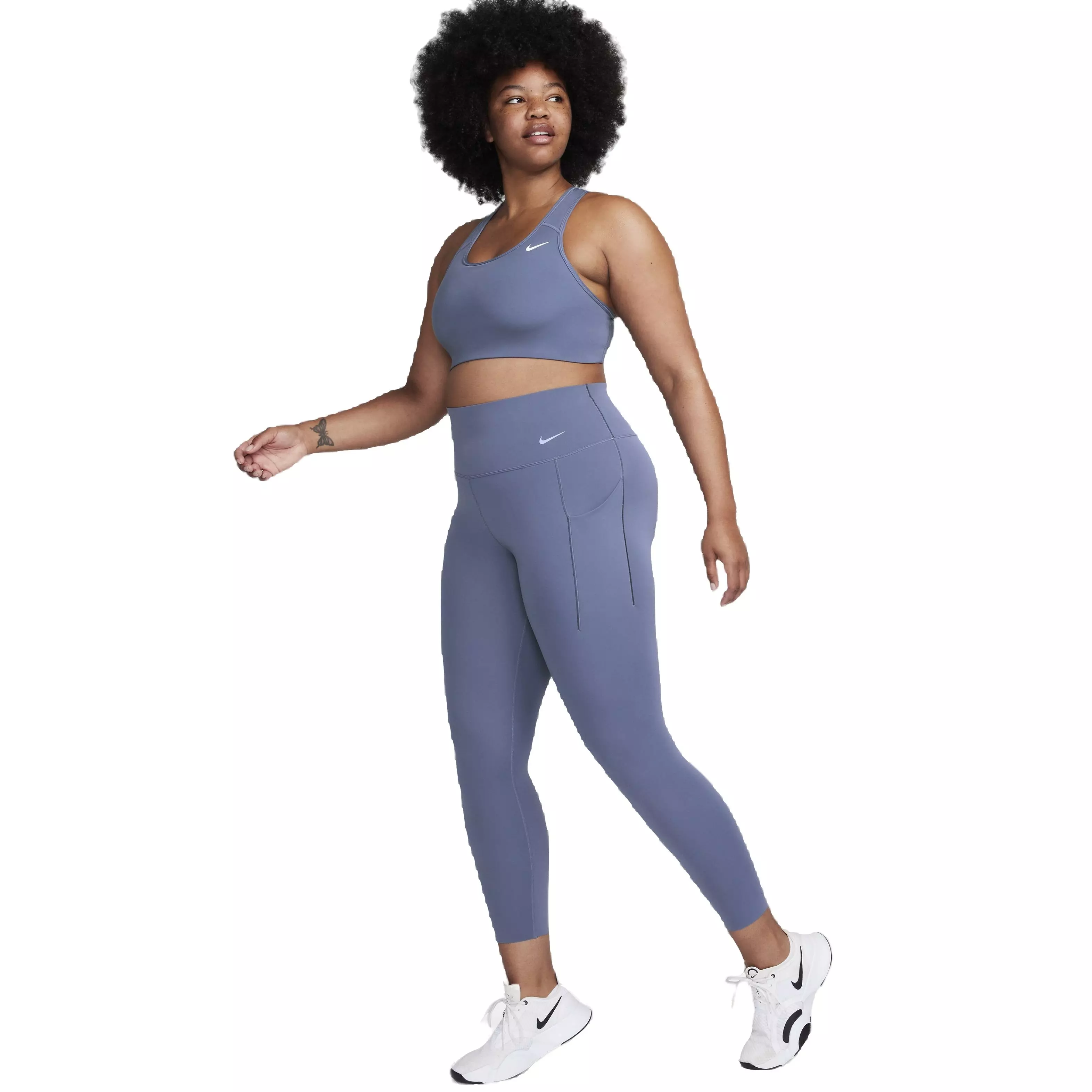 Nike Women's Dri-FIT Universa Medium Support High-Rise 7/8 Leggings with Pockets smooth and lift while stretching with every move. Their midweight InfinaSmooth fabric stays squat-proof and feels cool and sleek against your skin.