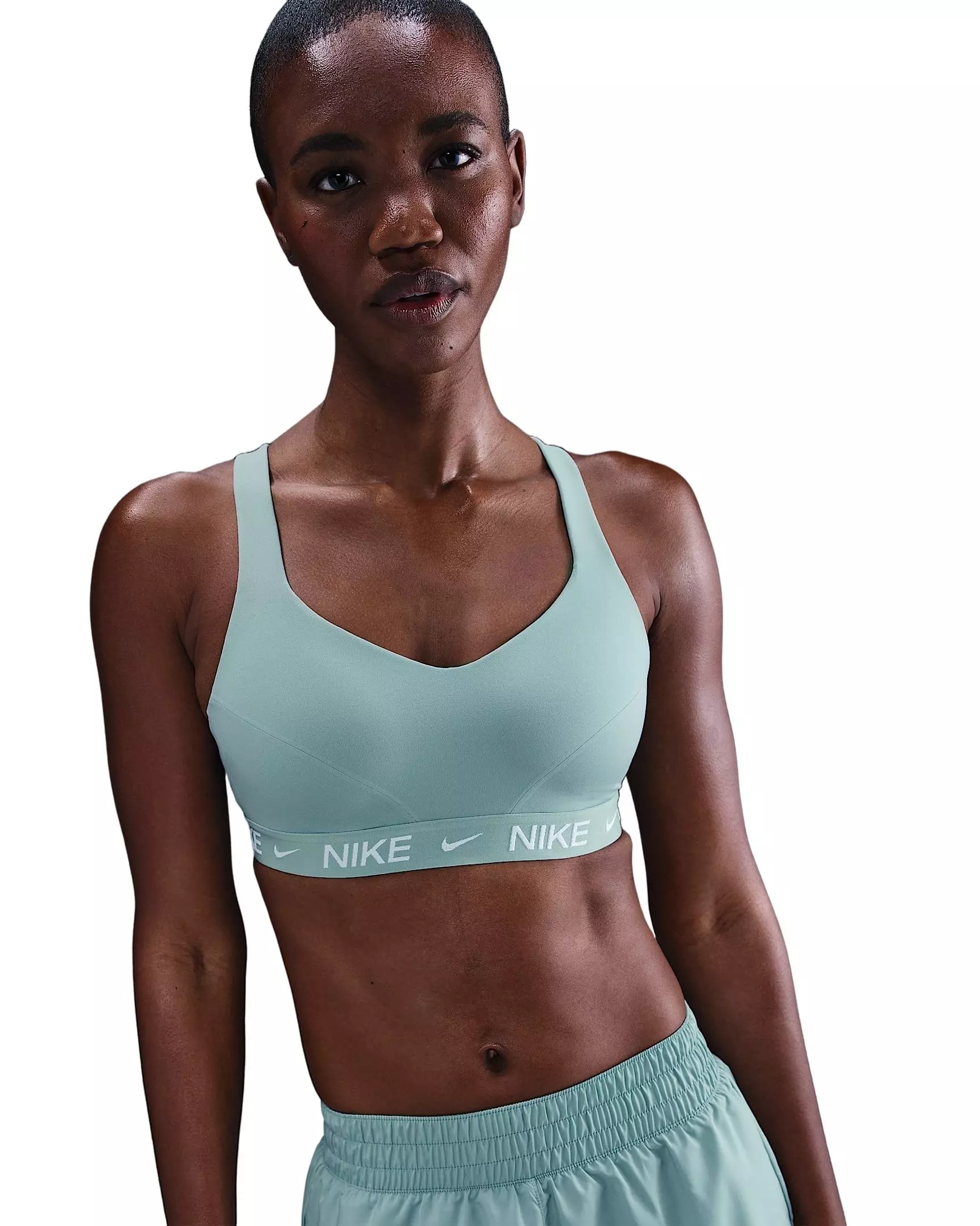 In this sleek, stay-put green Nike Women's Indy High Support Padded Adjustable Sports Bra, you're in control of your workout and your day. High support gives you a locked-in feeling and helps keep motion to a minimum, making it ideal for runs and high-impact sports. Smooth, quick-drying fabric gives the bra a clean finish so you can wear it your way.Features