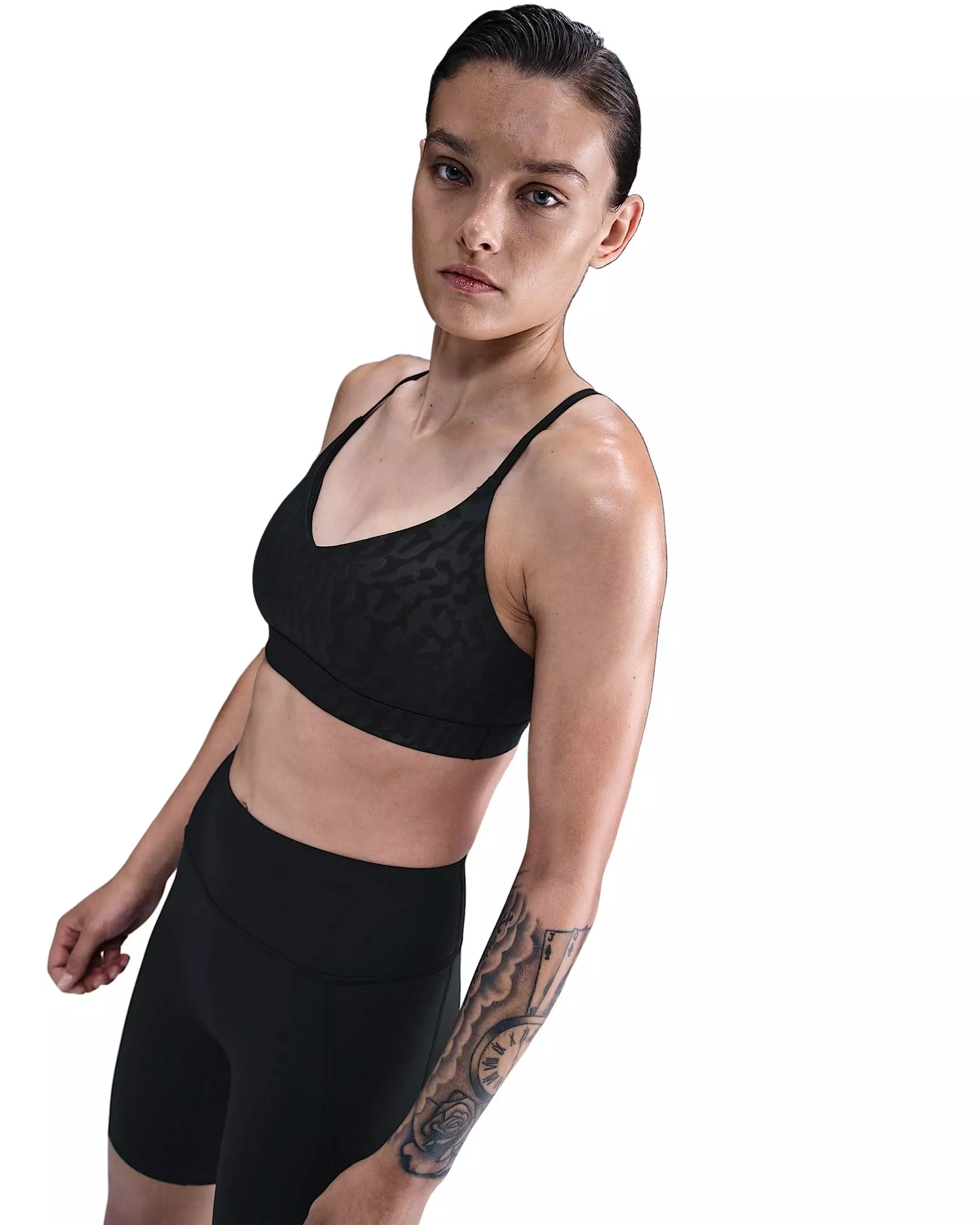 Don't let 'em see you sweat. Our sleek, low-profile black Nike Women's Indy Light-Support Padded Adjustable Sports Bra gets elevated with ultrasmooth, midweight fabric featuring moisture-concealing technology. Light support gives you a gentle hold with plenty of freedom that's great for low-impact workouts or all-day comfort.Features