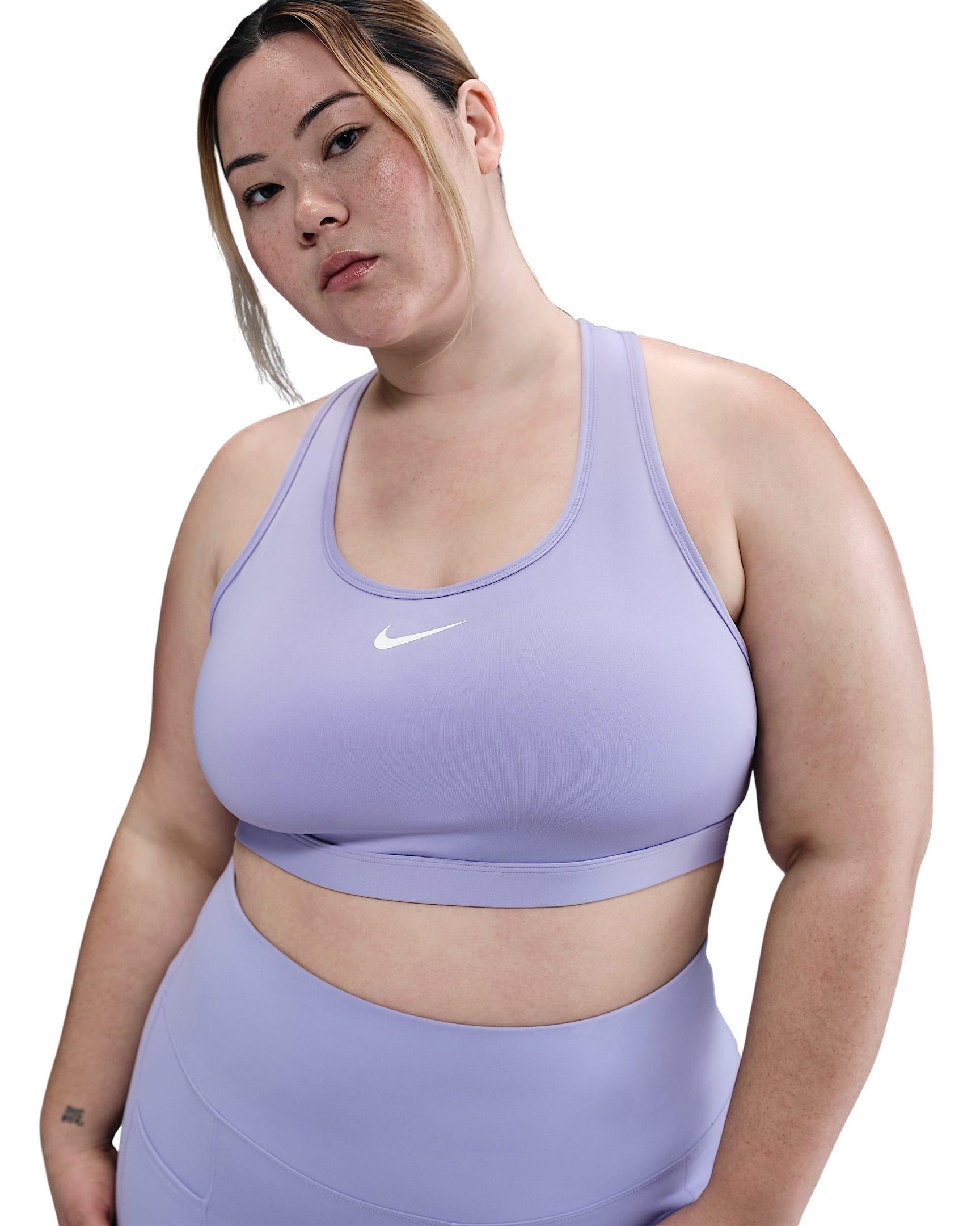 You're on the move. Your padding shouldn't be. This plus size purple Nike Women's Med Swoosh Padded Sports Bra's sewn-in pads stay in place so you can work hard without worrying about them shifting or folding. Great for training workouts and dance classes, medium support gives you a snug hold that helps keep everything in place. Plus, sweat-wicking, adaptive material quickly recovers its shape so you can stay comfortable throughout your workout.Features