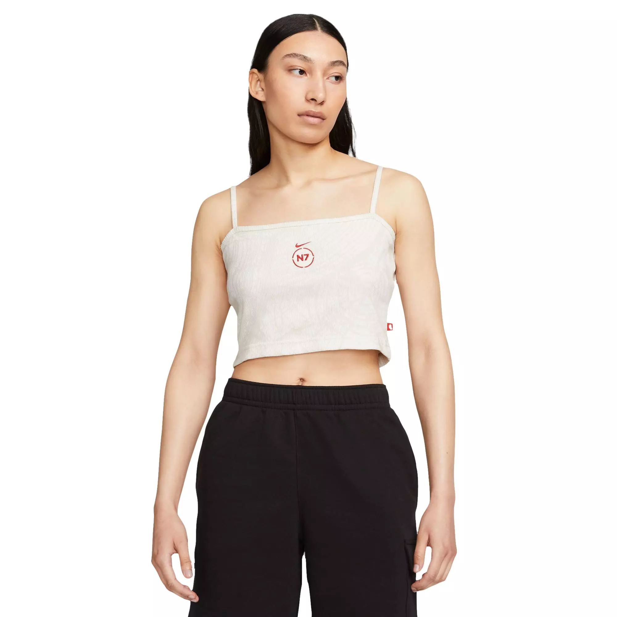 Add an athletic feel to your look with the Nike Women's N7 Essential Ribbed Crop Top - White. Its soft, cotton-rich fabric has just the right amount of stretch to help you move without distraction.