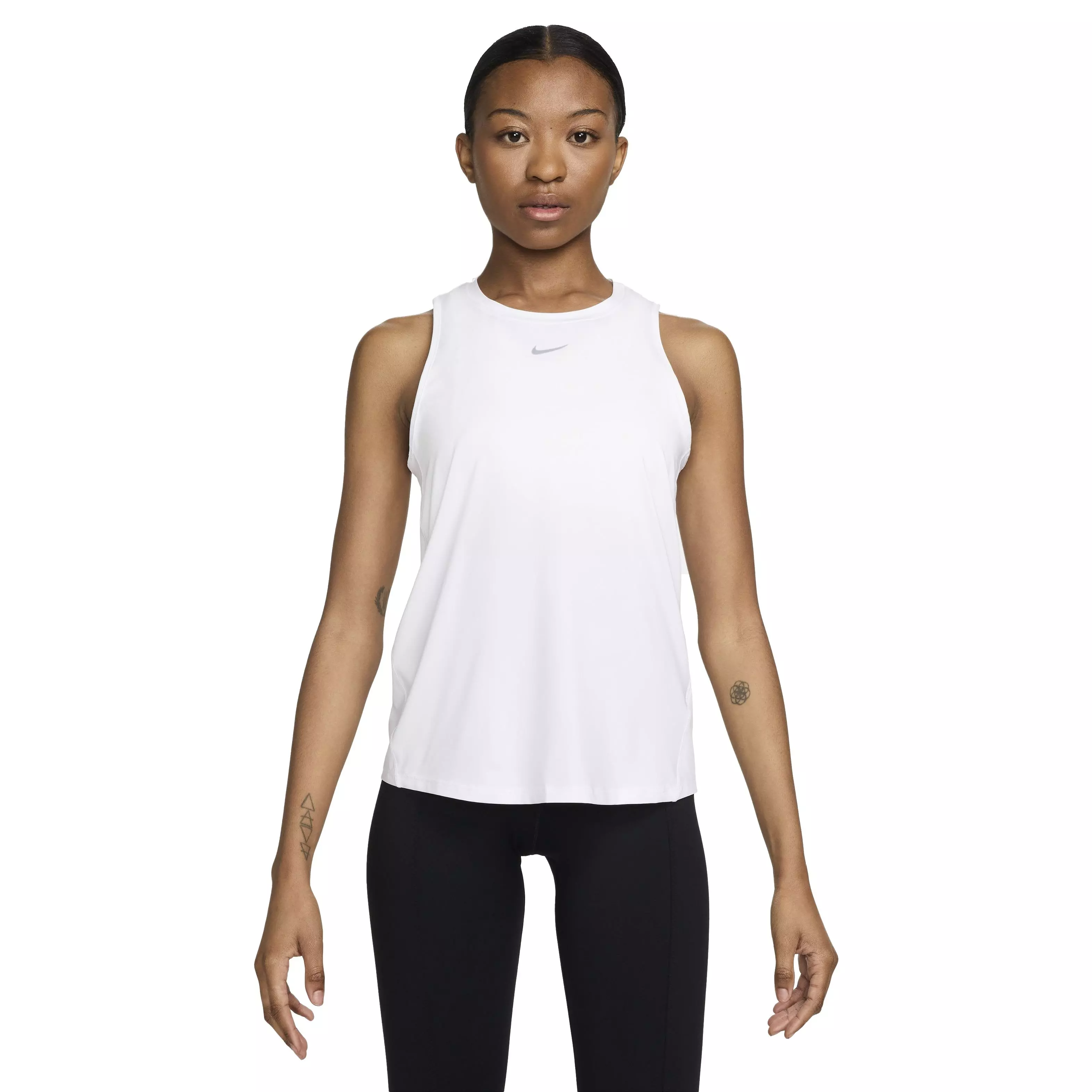 Experience comfort in the Nike Women's One Classic Dri-FIT Tank Top - White. Its lightweight, silky-smooth fabric dries quickly and moves with you throughout your day. Sweat-wicking technology helps maintain a dry feel while you stay active.