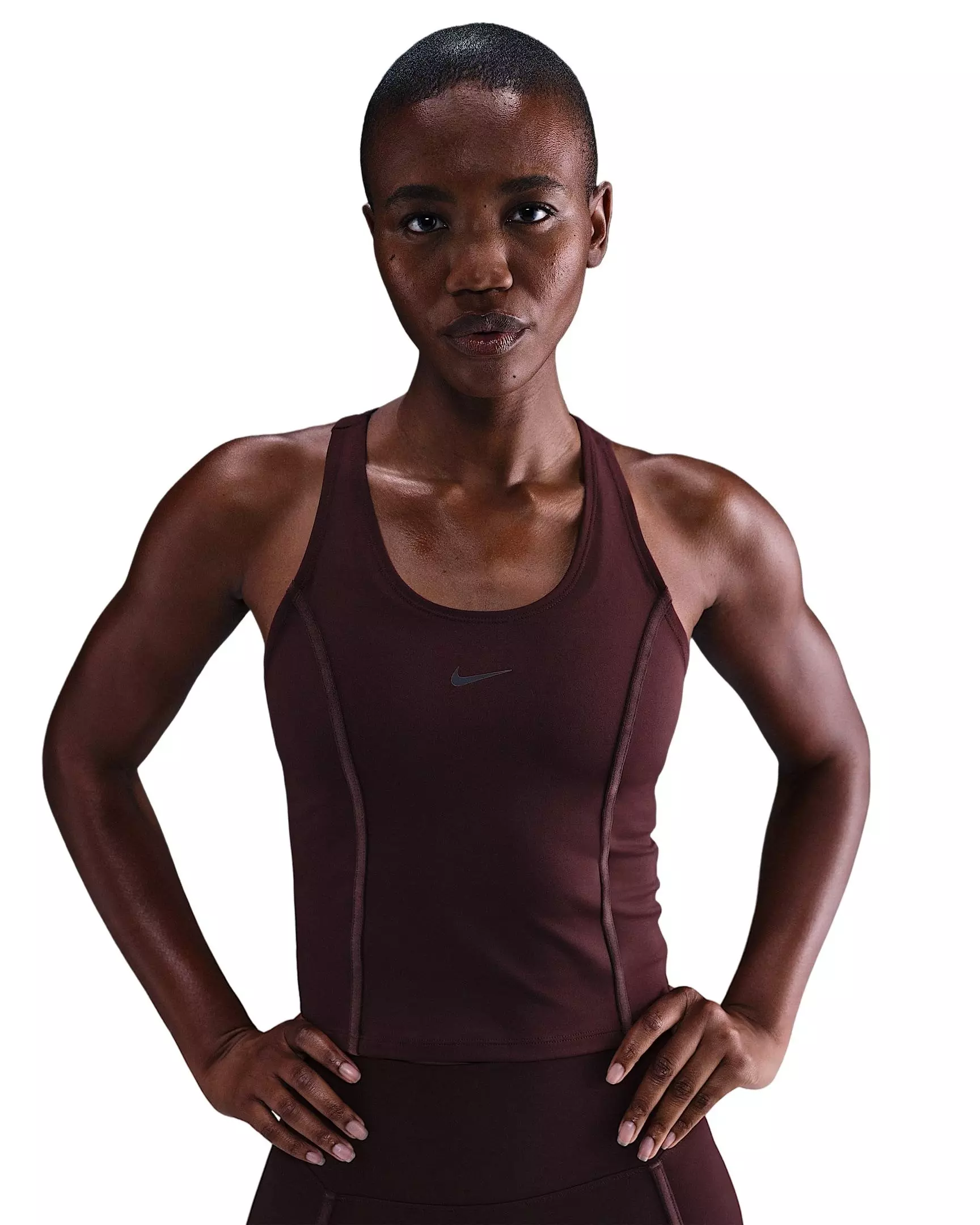 This burgundy Nike Women's One Dri-FIT Fitted Tank Top works for it all. Accented with velvet taping, this midweight, peachy-soft top stretches with you and dries quickly for every activity.Features