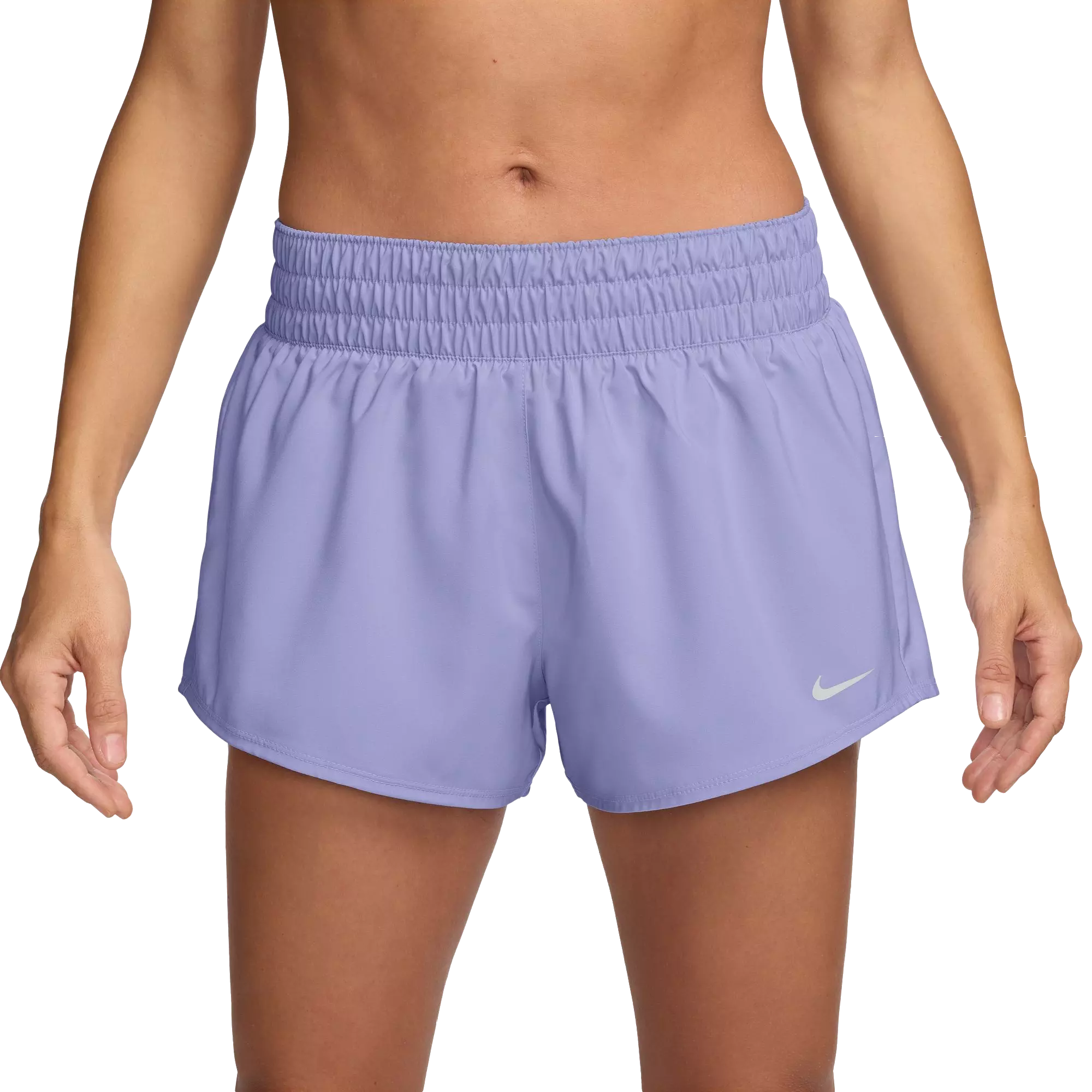 The Nike Women's One Dri-FIT Mid-Rise 3" Brief-Lined Shorts in Lilac feature a 3" mid-rise cut with integrated brief lining for stable coverage. The ultrasoft woven fabric feels silky smooth and is enhanced with Dri-FIT technology to wick away sweat, keeping you dry and comfortable throughout activity.