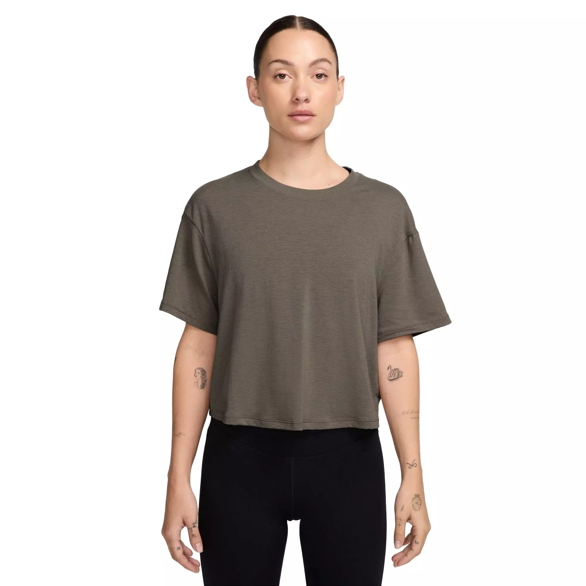 Meet the Nike Women's One Relaxed Dri-FIT Cropped Short-Sleeve Top. Slightly textured, lightweight jersey fabric dries quickly and wraps you in breathable comfort. Dri-FIT moisture-wicking technology pulls sweat away, ensuring a fresh feel during activity and downtime.
