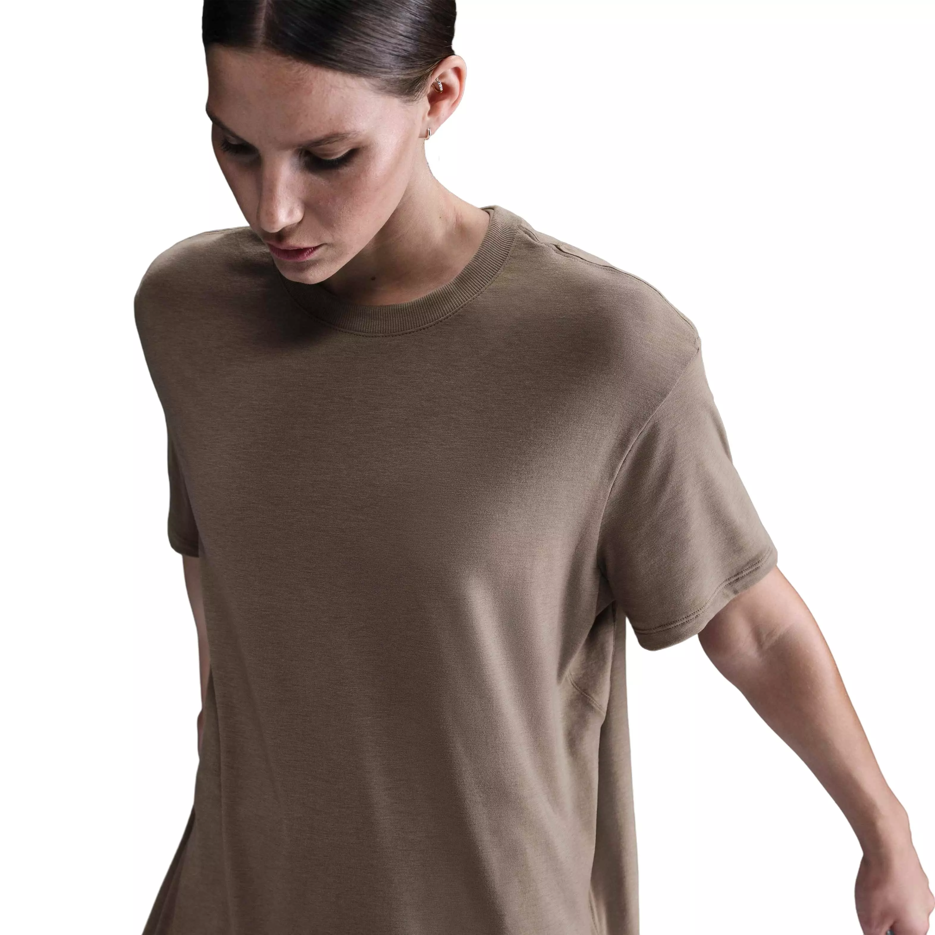 Up for a workout or down to chill, this Nike Women's One Relaxed Dri-FIT Short-Sleeve Top - Brown is ready for whatever you are. Slightly textured, incredibly lightweight jersey fabric dries quickly and drapes you in comfort that goes with any activity. A loose, roomy fit and extended length help keep you covered and cozy from your morning stroll to your evening wind-down—and at all the stops in between.Features