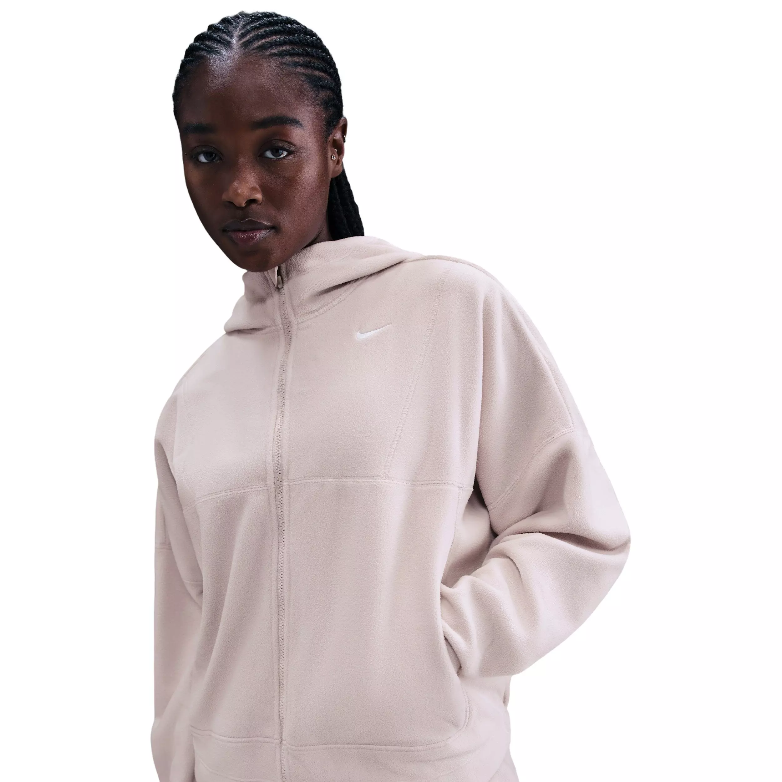 Don't let the cold put an end to your training. Brushed on both sides for a soft and fuzzy feel, this lightweight lt pink fleece layer Nike Women's One Therma-FIT Full-Zip Top uses our heat-regulating tech to help you stay warm. A spacious fit and curved back hem give you extra coverage.