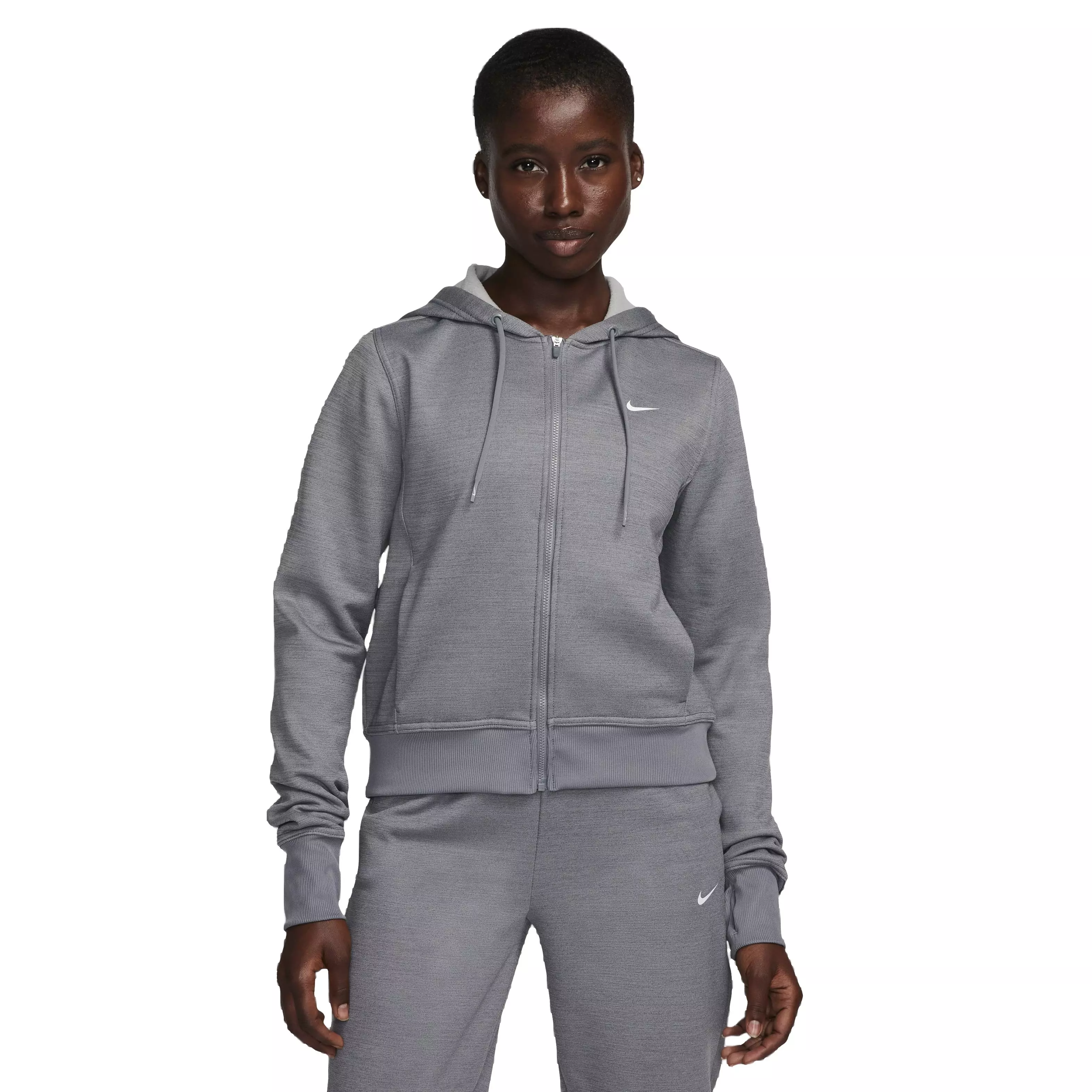 Smooth exterior fabric meets soft brushed fleece inside. A relaxed fit teams with hand pockets, zip-front styling and heat-regulating Therma-FIT technology to keep warmth balanced whether indoors or outdoors. The jacket layers easily over workout gear or casual outfits.