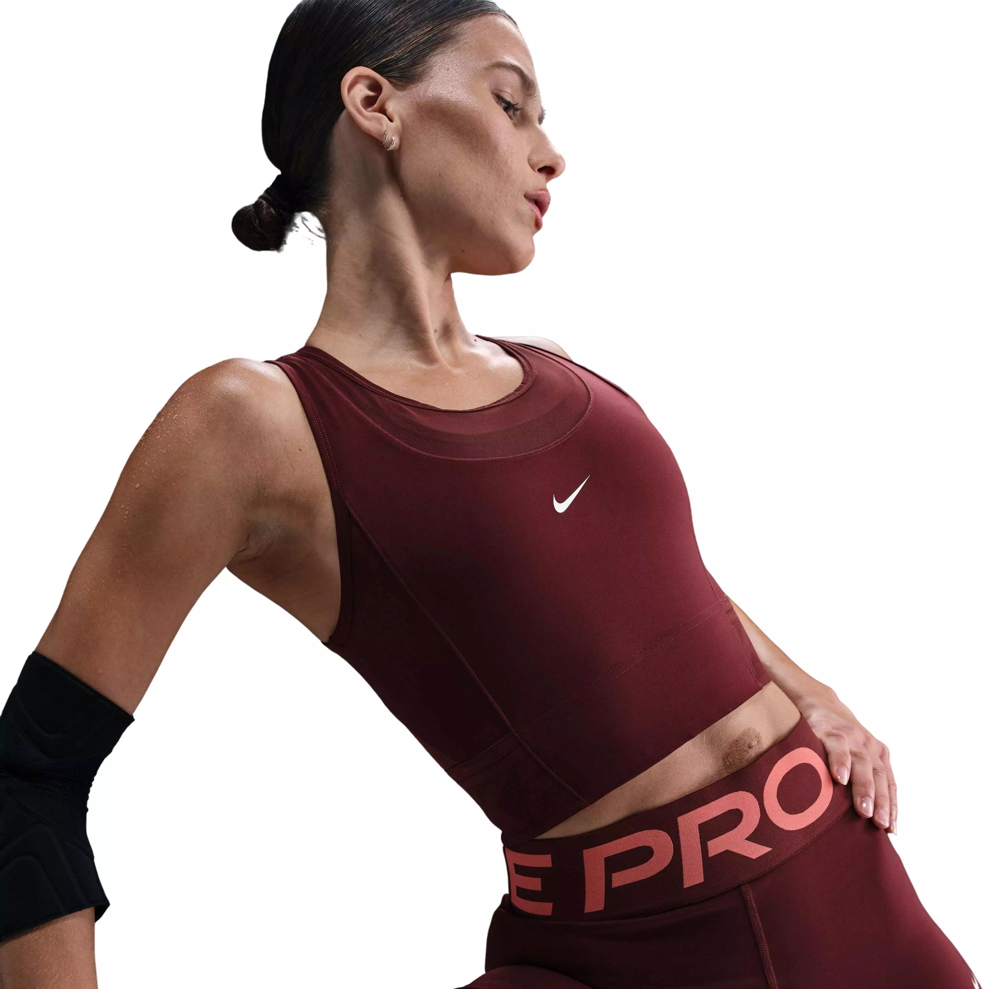This Nike Women's Pro Dri-FIT Cropped Tank Top-Red's sheer mesh panels and moisture-wicking tech help keep you ready to sweat. Breathable panels at the hem give you a snug fit while inviting airflow.