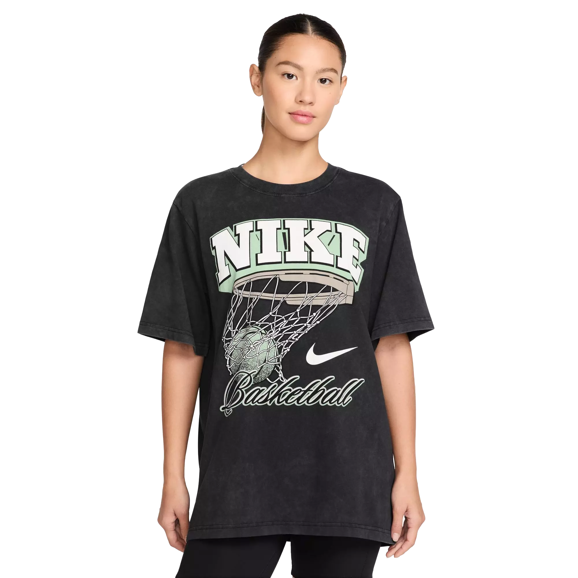 The Nike Women's Short-Sleeve Basketball Tee-Black/Teal features midweight cotton that feels soft and lightly textured against the skin. A loose cut drapes gently over the torso and offers a roomy, comfortable fit that supports active wear.