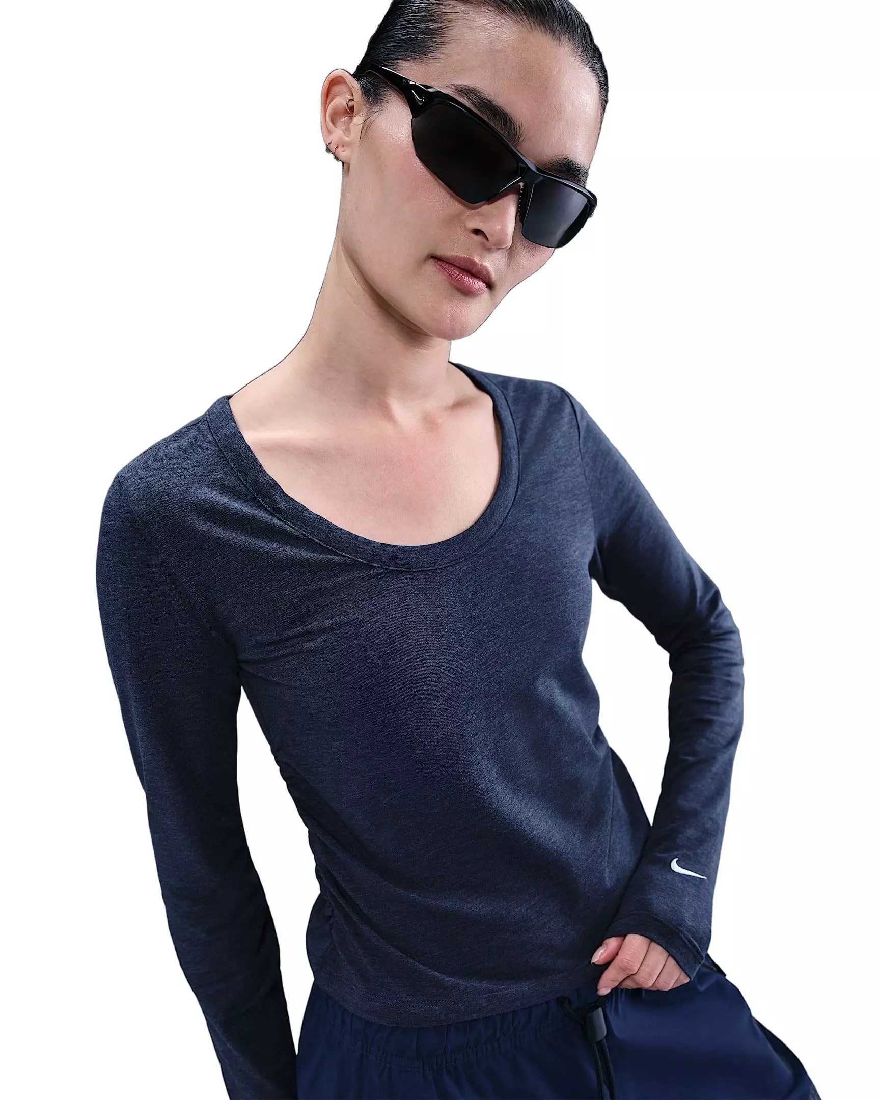 Soft jersey fabric and ruched sides bring everyday ease to the Nike Women's Sportswear Chill Knit Long-Sleeve Top - Navy. The smooth, stretchy knit drapes comfortably, pairing effortlessly with leggings or denim for laid-back days or light errands.